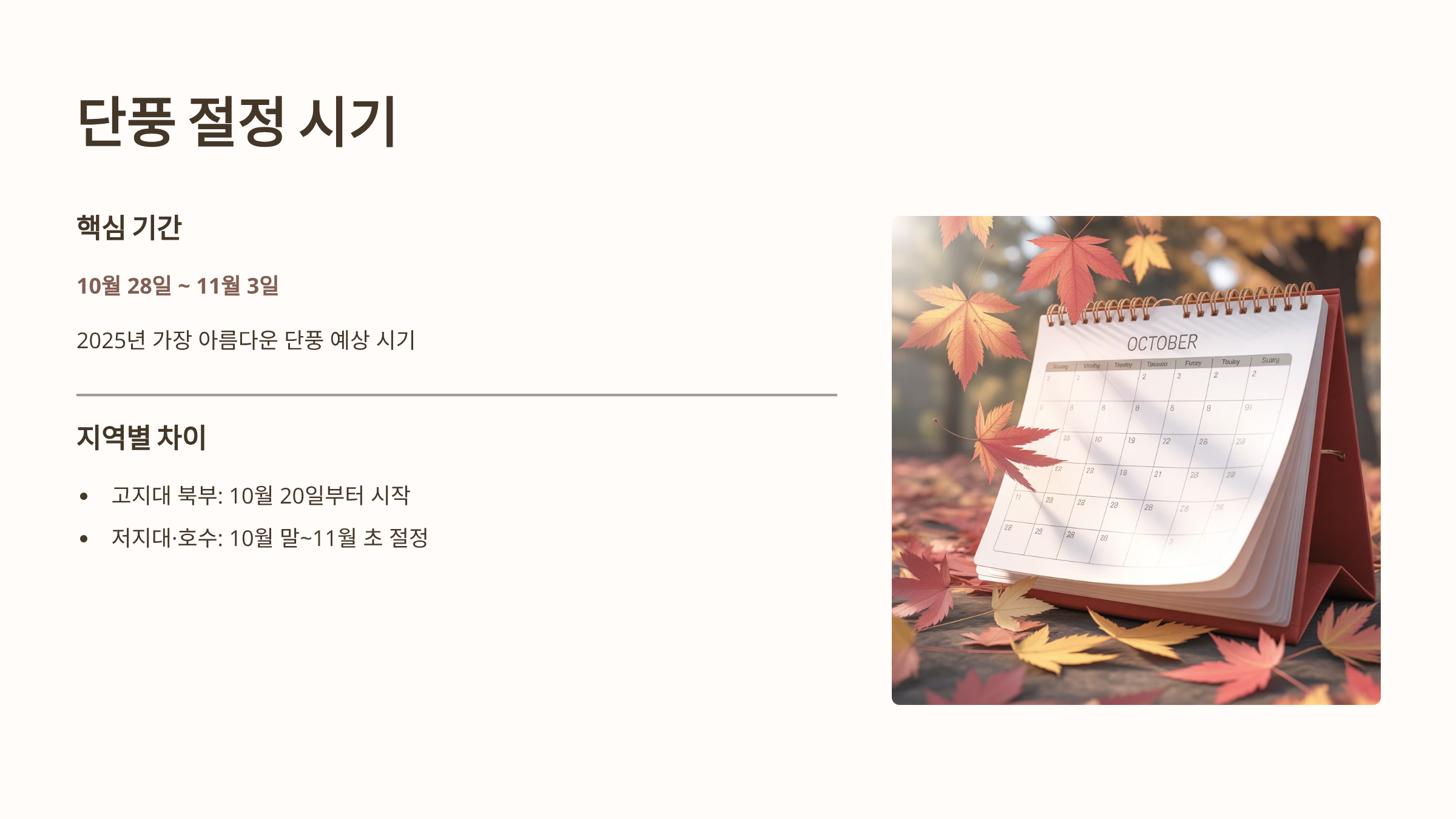 - 2025년 예측: 기후 변화로 인해 단풍 절정 시기는 매년 변동되지만, 2025년 역시 10월 28일~11월 3일 사이를 가장 아름다운 단풍을 볼 수 있는 핵심 기간으로 예상하고, 이 시기에 맞춰 방문 계획을 세우는 것이 안전합니다.