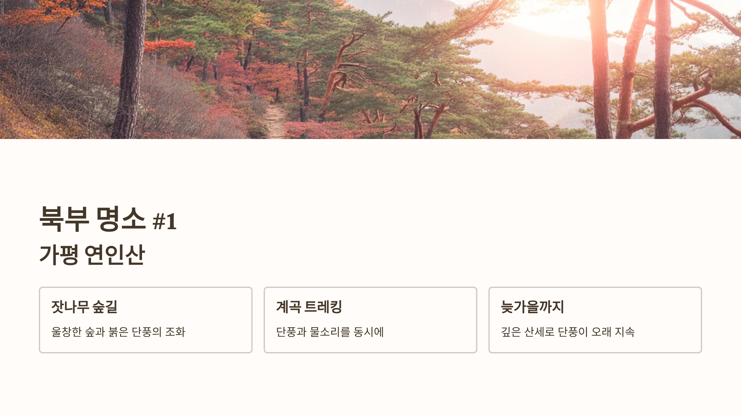 경기도 북부는 깊은 산세와 잣나무 숲이 특징으로, 단풍이 질 때도 고즈넉하고 웅장한 가을 분위기를 연출합니다.