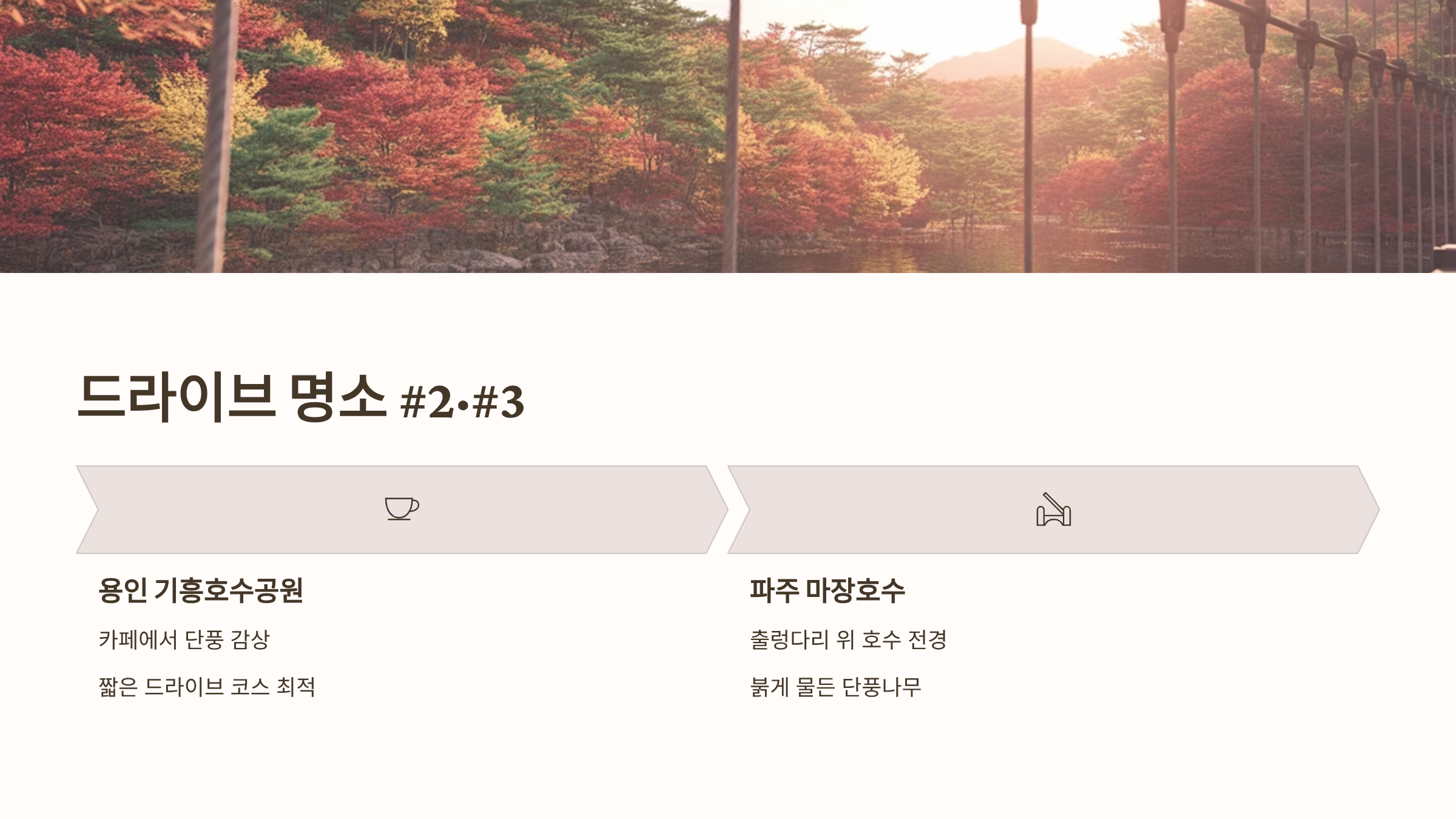 - 용인 기흥호수공원: 기흥호수 주변으로 조성된 산책로 주변 단풍이 아름답습니다. 호수 주변 카페에서 커피를 마시며 단풍을 감상하는 것도 힐링입니다. 접근성이 좋아 짧은 드라이브 코스로 적합합니다.