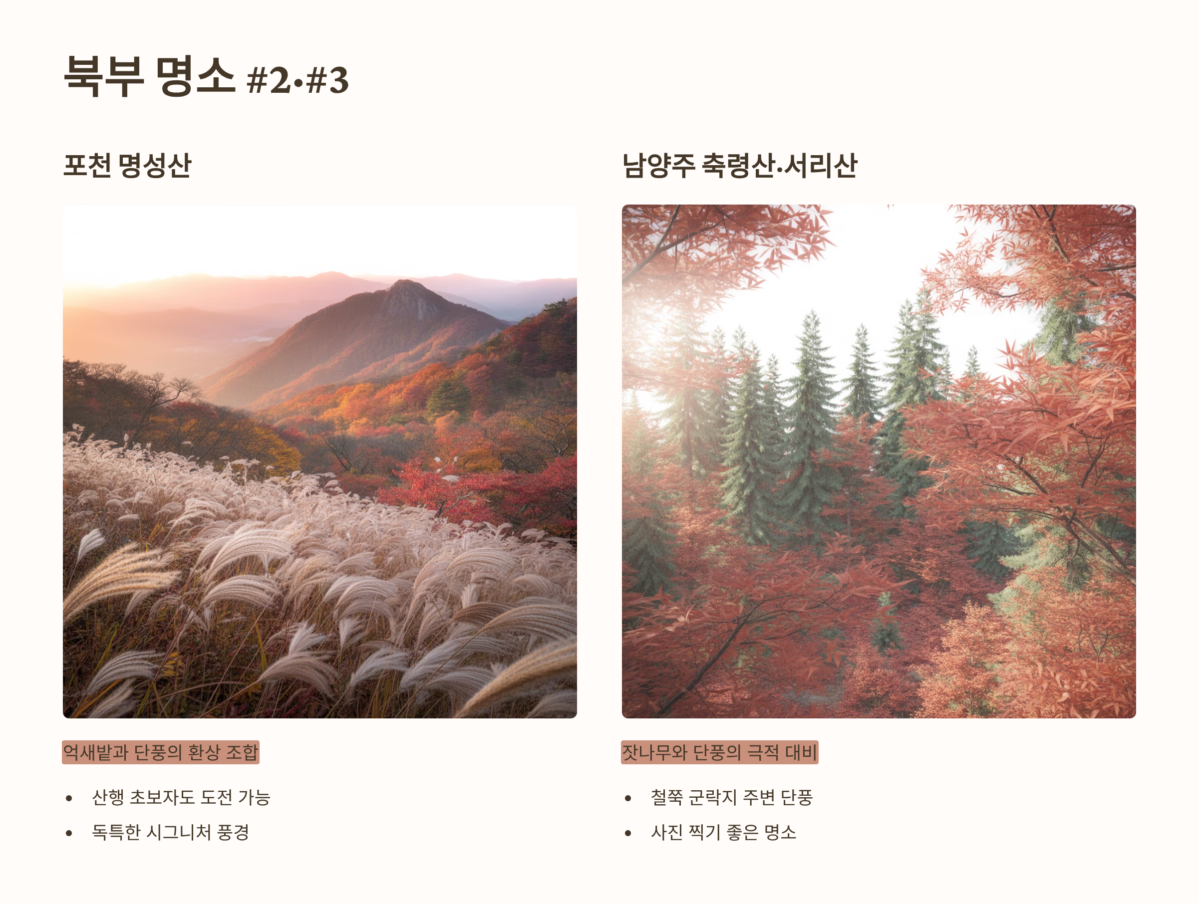 - 포천 명성산: 억새 명소로도 유명하지만, 등산로를 따라 형성된 단풍도 절경입니다. 억새밭과 붉은 단풍이 어우러진 풍경은 다른 곳에서 보기 힘든 명성산만의 시그니처입니다. 난이도가 높지 않아 산행 초보자도 도전하기 좋습니다.