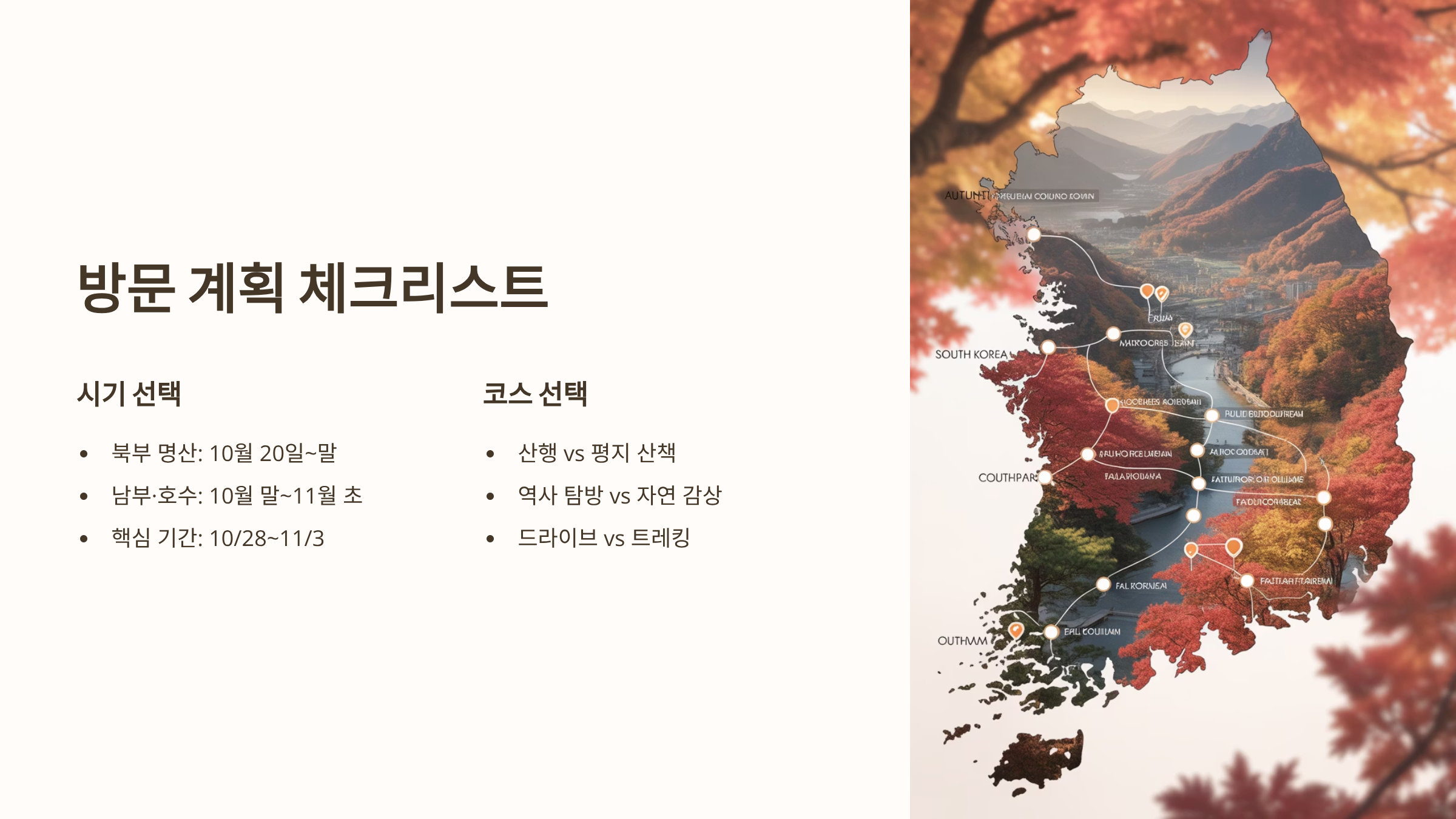 경기도 단풍명소는 고도와 지형에 따라 다양한 매력을 가지고 있습니다. 10월 말부터 11월 초 절정 시기를 놓치지 않으려면 북부 명산의 빠른 단풍과 남부 호수 주변의 늦은 단풍 시기를 참고해야 합니다. 역사적 가치를 지닌 고즈넉한 명소부터, 잣나무 숲길의 웅장한 가을 감성, 그리고 노약자도 편안하게 즐길 수 있는 무장애길까지, 이 포스팅에서 안내한 테마별 명소 정보를 활용하여 올가을 경기도 단풍놀이를 가장 풍성하고 만족스럽게 계획하시기를 바랍니다.