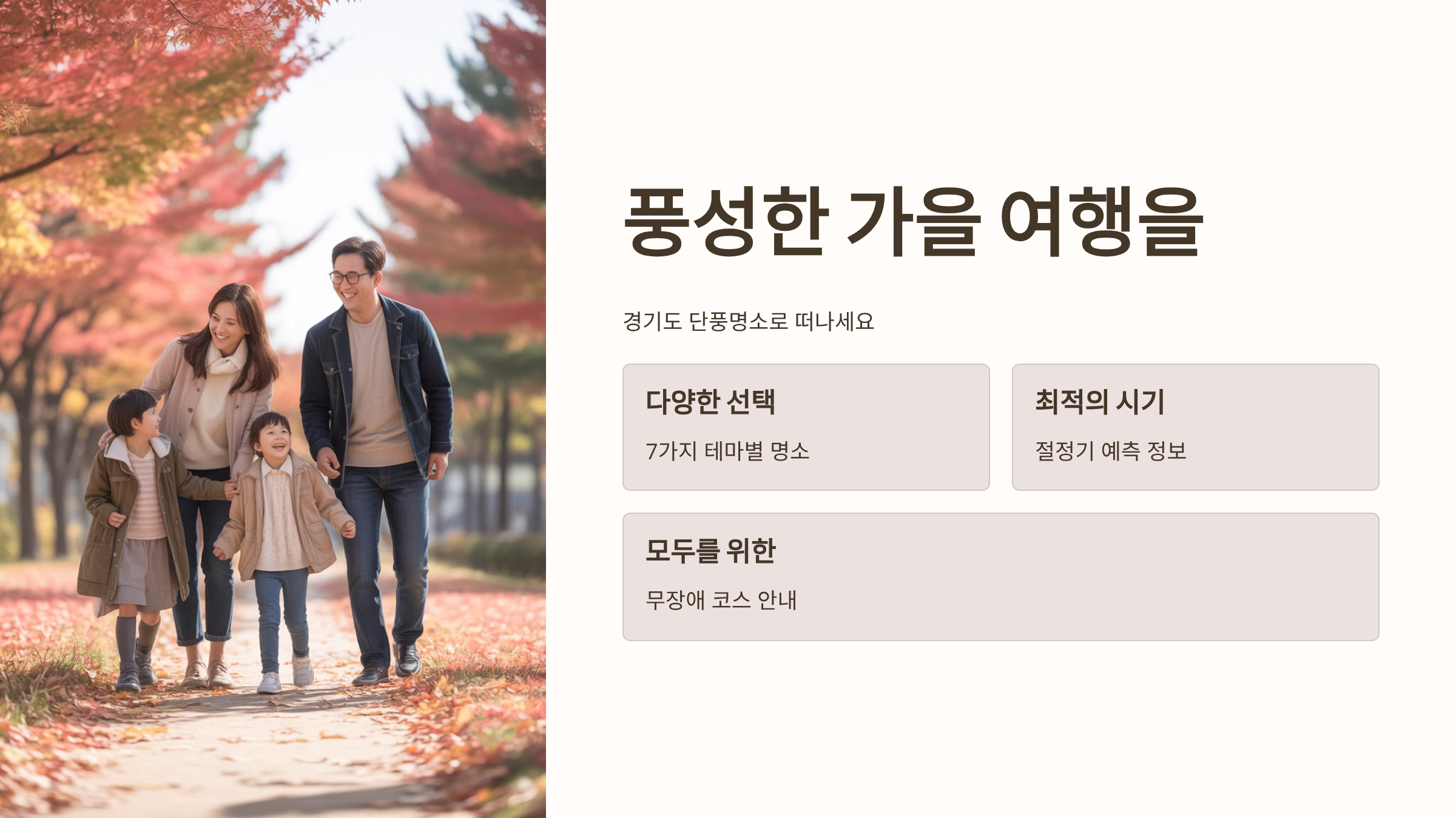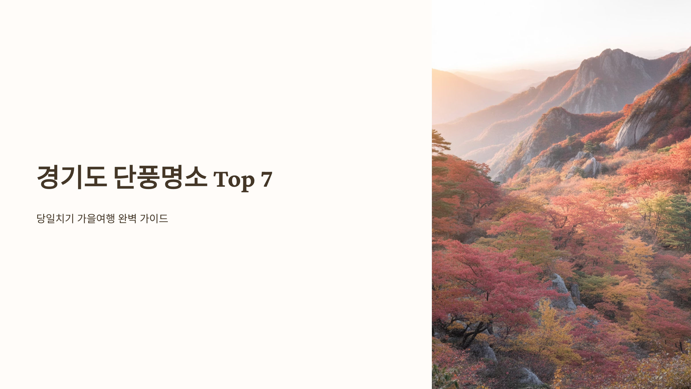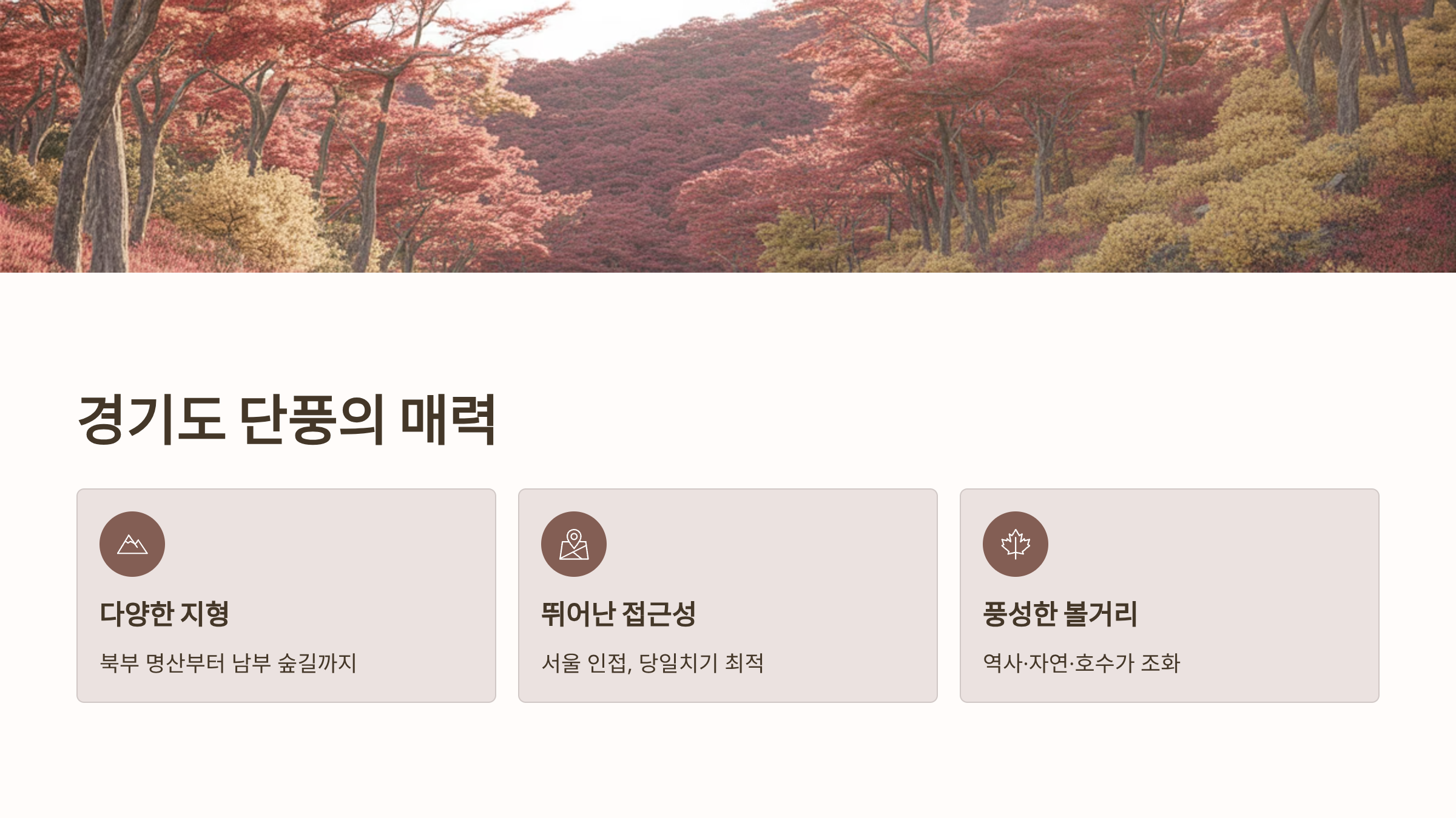 경기도는 서울과 인접해 접근성이 뛰어나면서도, 북부의 명산과 남부의 고즈넉한 숲길이 조화롭게 어우러져 다양한 매력의 단풍을 즐길 수 있는 곳입니다.