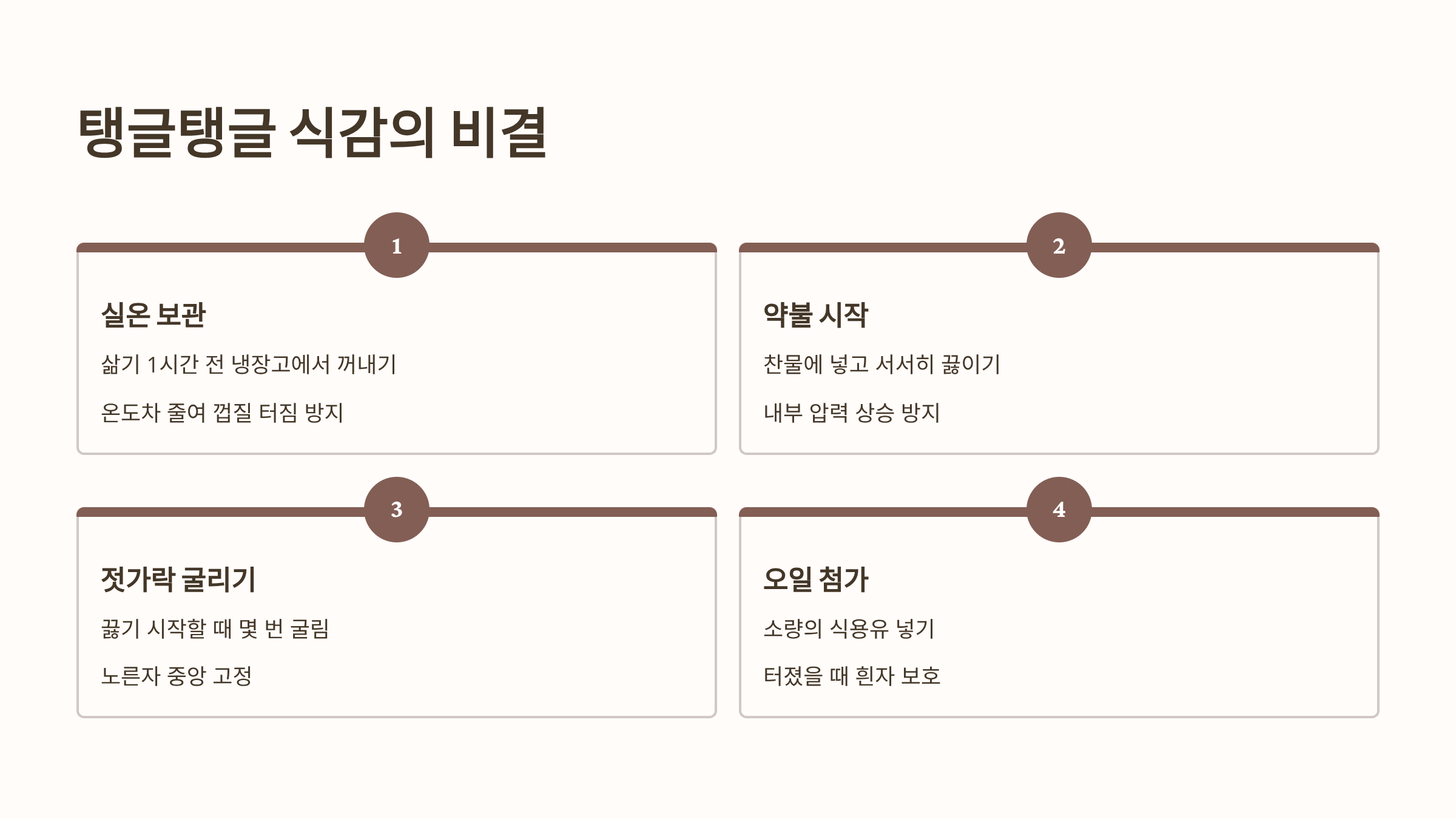 가장 이상적인 반숙부터 완숙까지 시간별 계란 삶는법을 구체적으로 제시합니다. 껍질을 한 번에 깔끔하게 까는 핵심 비법(소금/식초 첨가, 급랭)과 함께, 삶는 도중 계란이 깨지는 것을 막고 탱글탱글한 식감을 살리는 방법까지 안내합니다. 노른자 위치를 가운데에 고정하는 팁과 삶은 계란의 올바른 보관 및 활용법을 포함합니다.