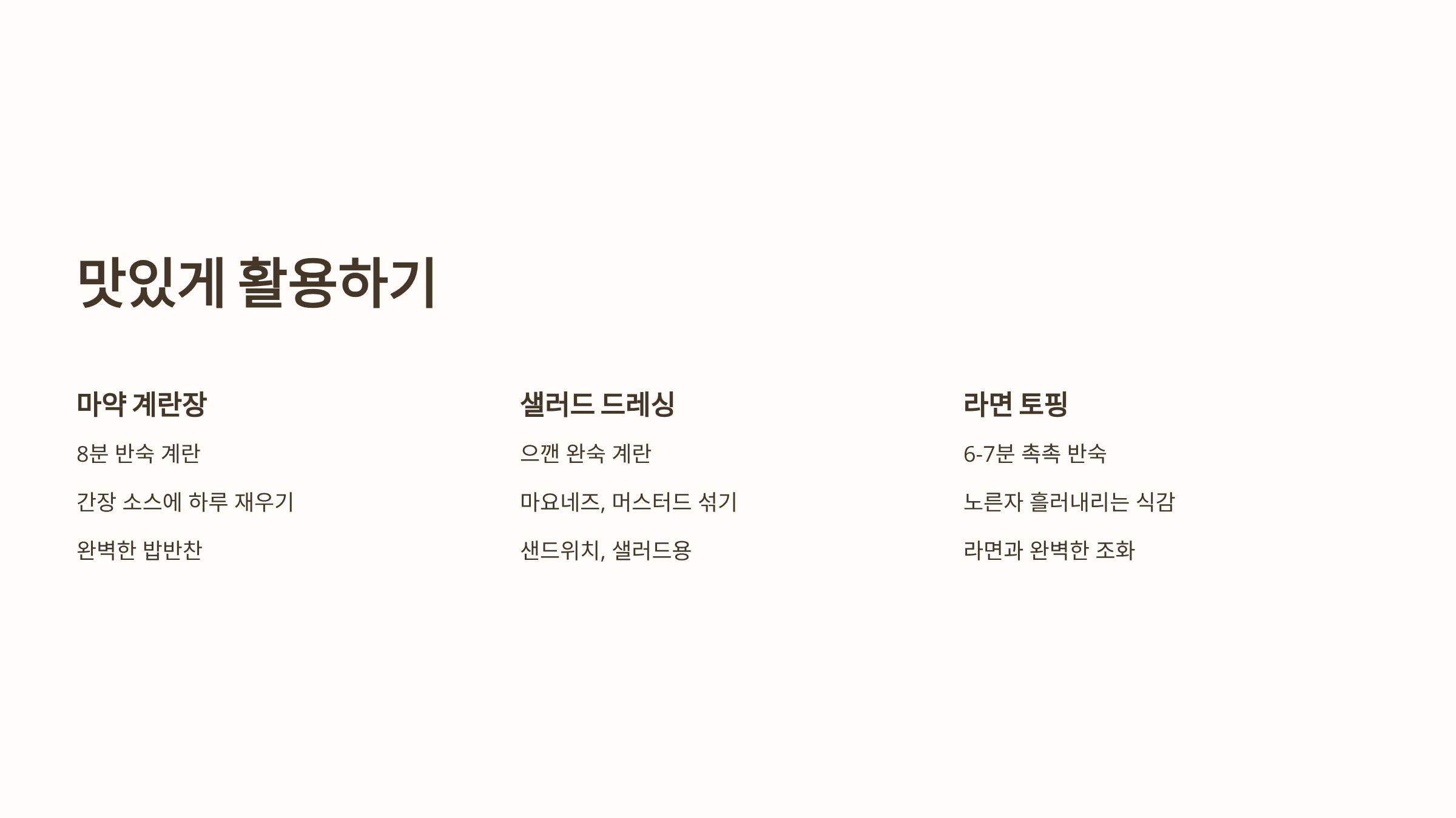 - 샐러드 드레싱: 으깬 완숙 계란에 마요네즈, 소금, 후추, 머스터드를 약간 섞어 샐러드나 샌드위치용 드레싱으로 활용하면 좋습니다.