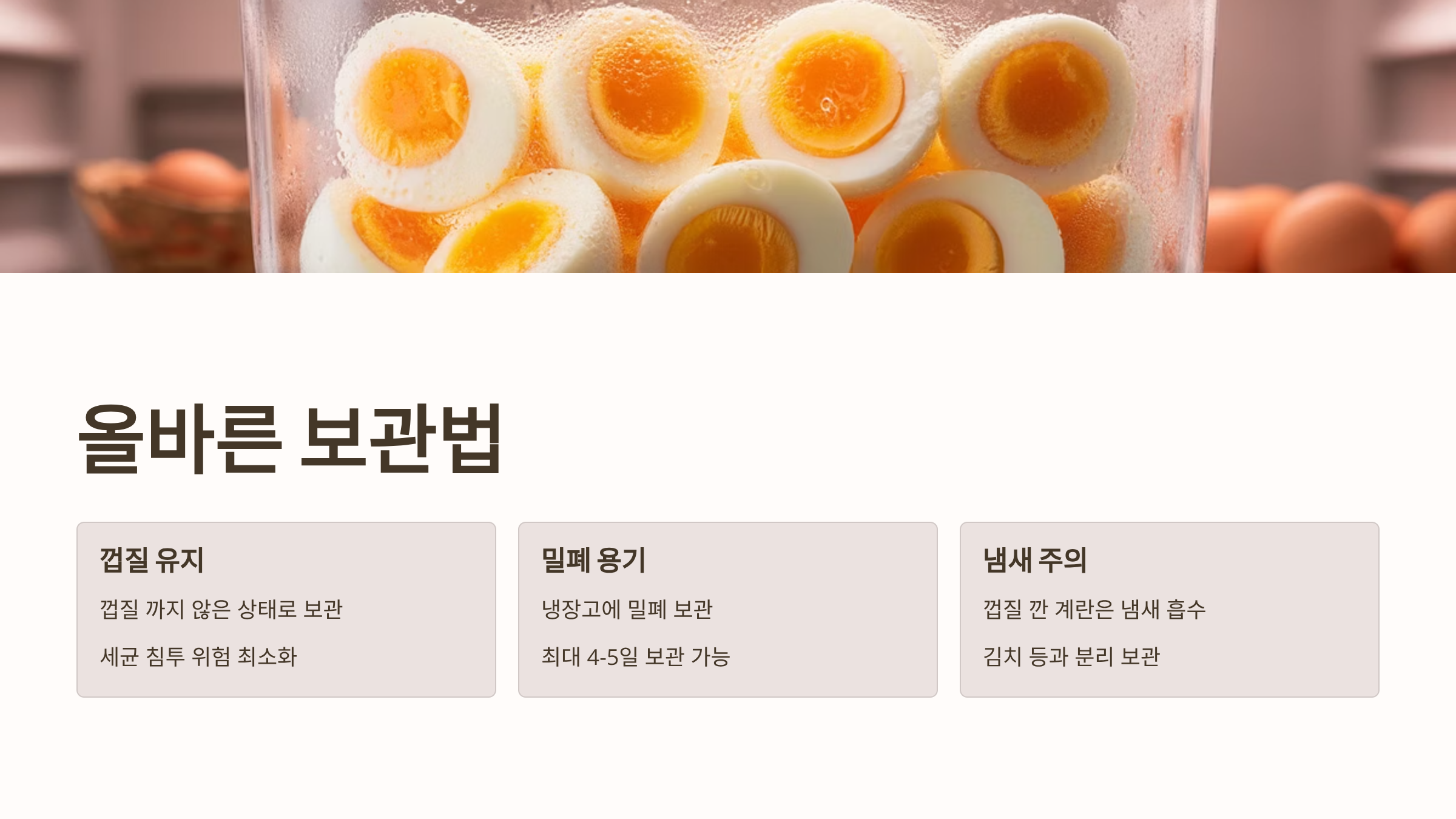 - 냄새 주의: 껍질을 깐 계란은 쉽게 냄새를 흡수하므로, 김치 등 냄새가 강한 음식과 함께 보관하지 않도록 주의해야 합니다.