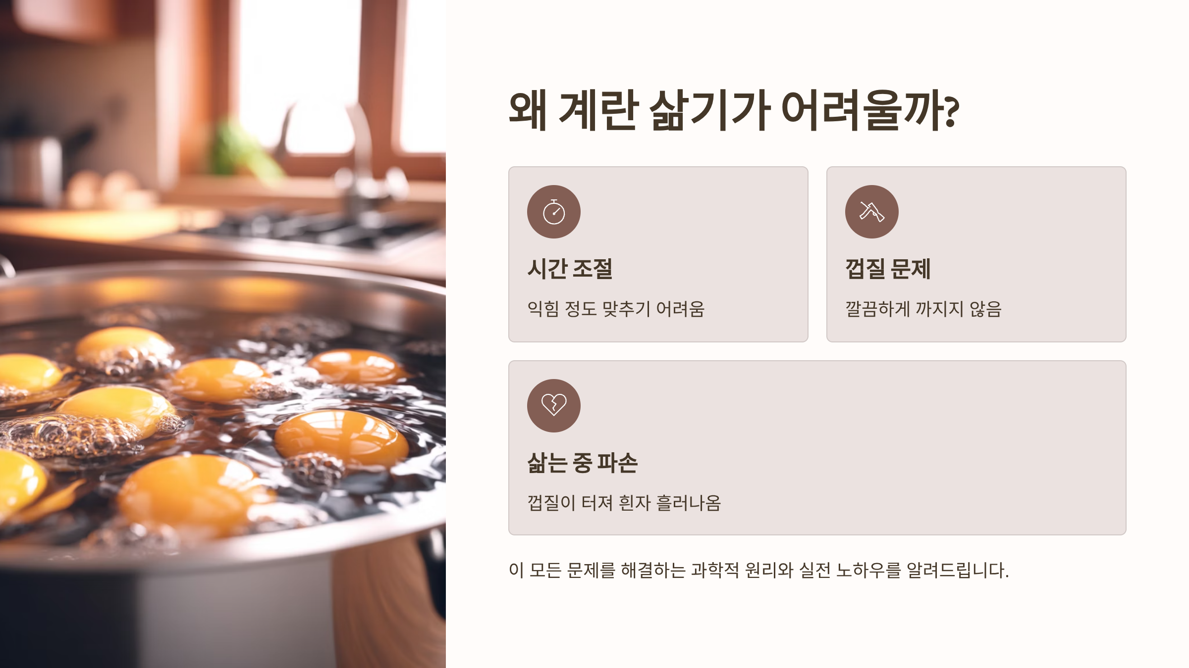 계란을 삶다가 껍질이 깨지면 흰자가 흘러나와 지저분해지고 식감이 떨어집니다. 깨짐을 막고 식감을 살리는 노하우입니다.