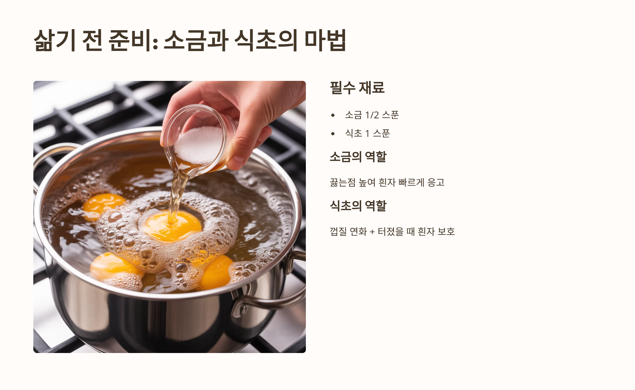 - 삶기 전 준비 팁 (필수): 계란을 삶기 전에 소금 1/2 스푼과 식초 1스푼을 넣어줍니다.