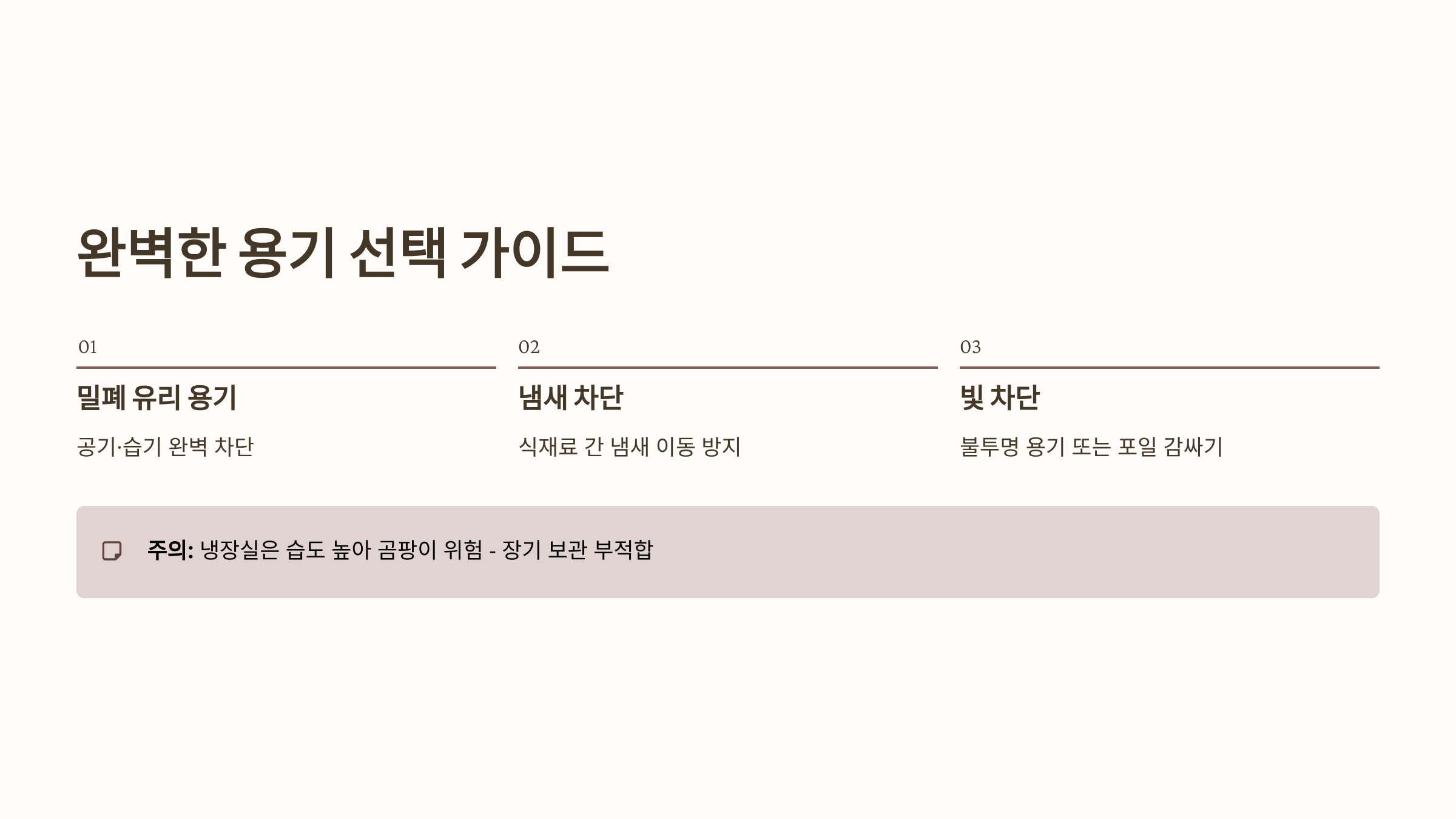 - 밀폐성: 공기와 습기의 유입을 완벽하게 차단하는 뚜껑 밀폐력이 뛰어난 유리 용기가 가장 이상적입니다.