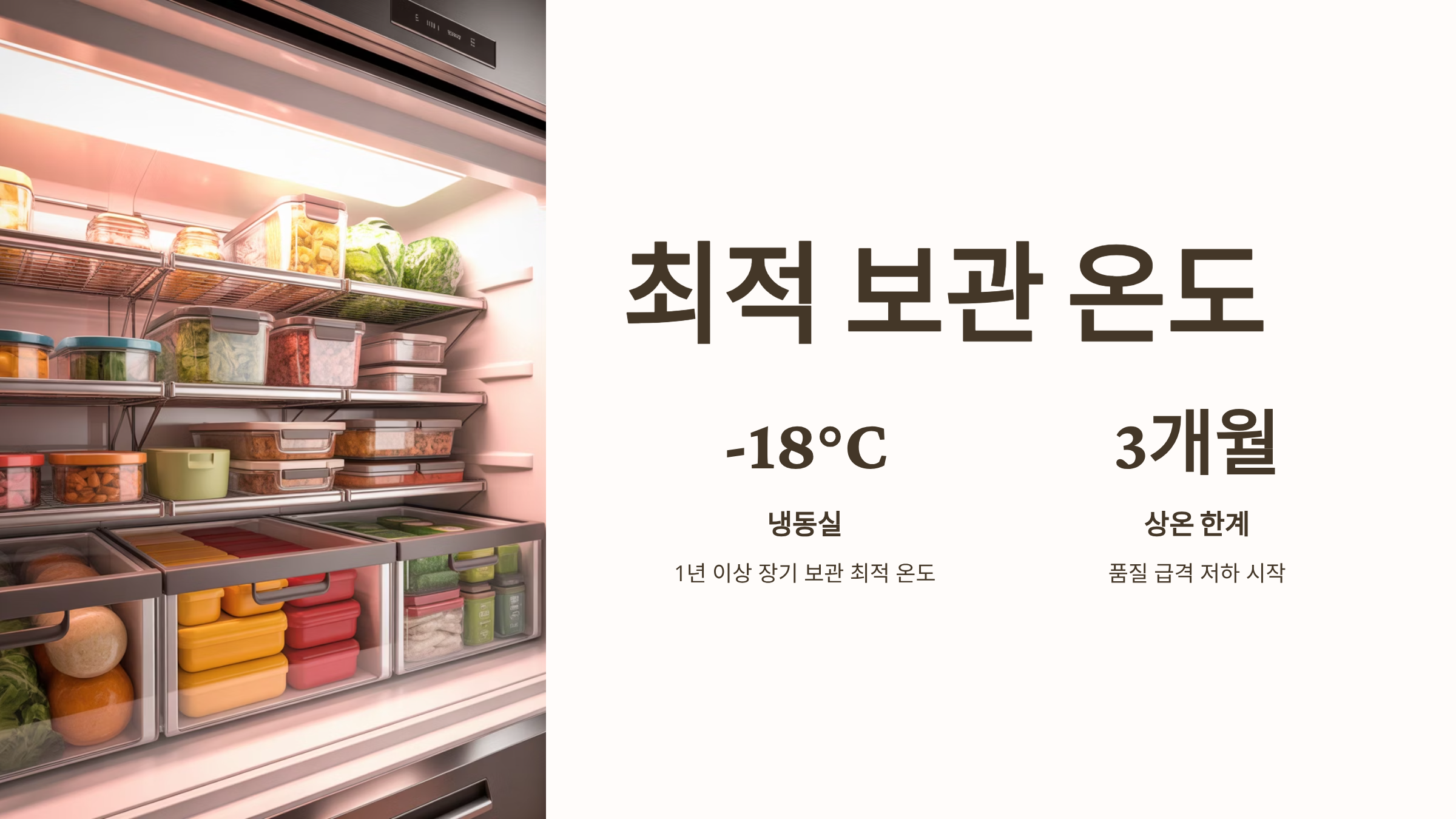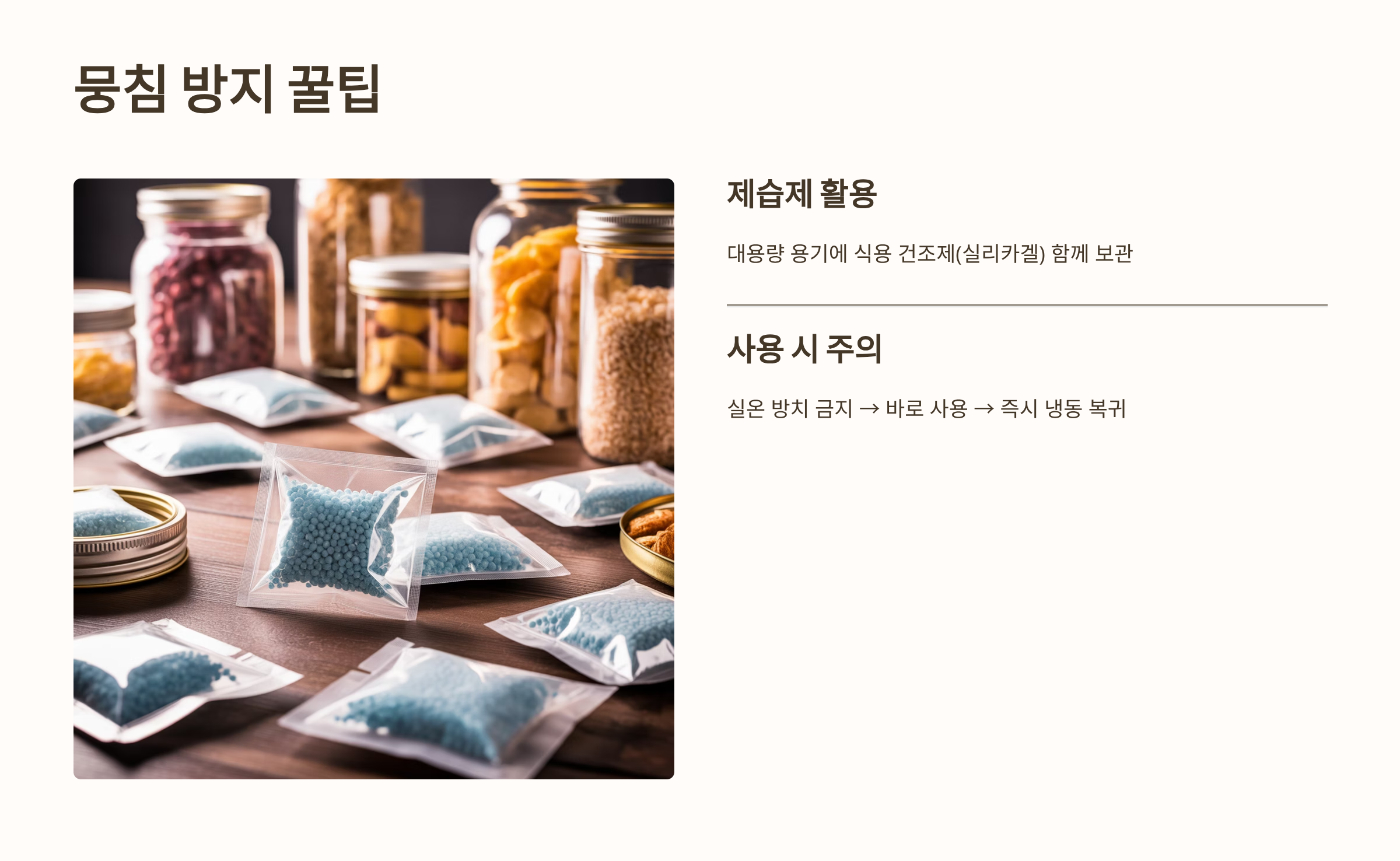 - 2중 포장: 소분된 지퍼백을 다시 밀폐력이 좋은 플라스틱 용기나 뚜껑이 있는 통에 넣어 2중으로 밀봉합니다. 이는 냉동실 내외부 온도차로 인한 결로(습기) 발생을 최종적으로 차단합니다.