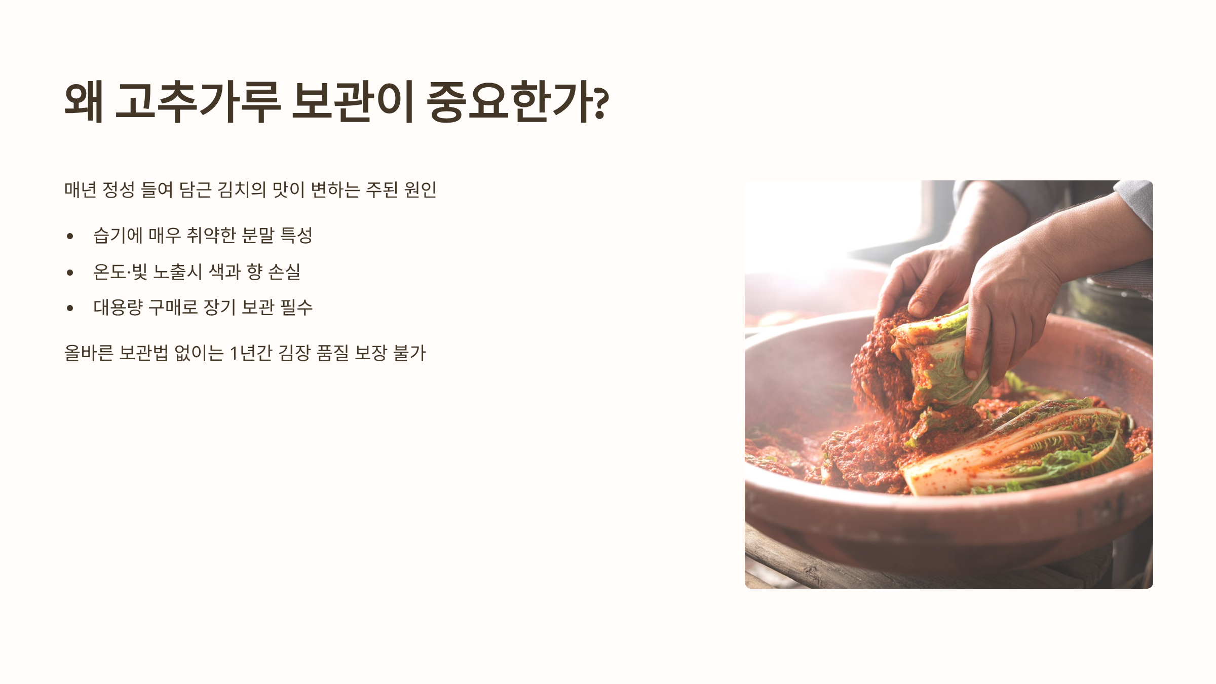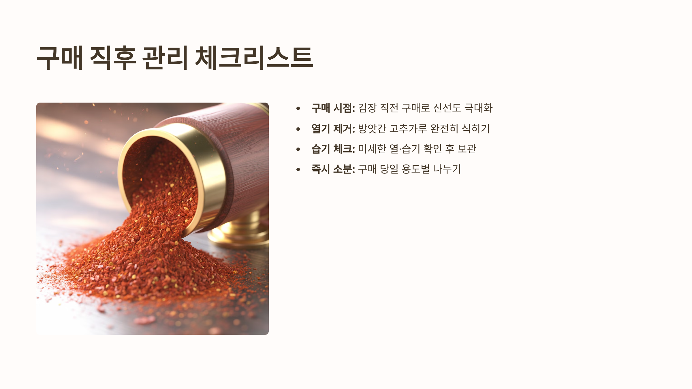 이 글은 고춧가루를 잘못 보관하면 색이 변하고 곰팡이가 생겨 김장의 맛을 완전히 망칠 수 있음을 강조하며, 고춧가루 변질의 주범인 습기, 온도, 빛 3가지 요인을 분석합니다.