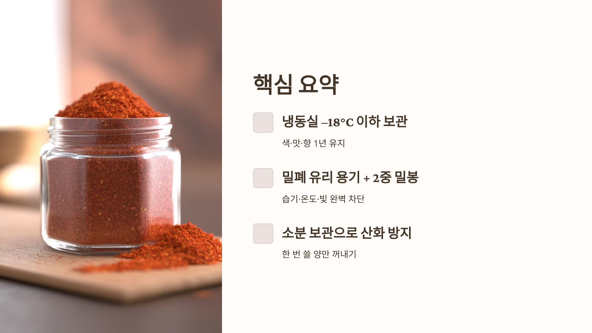 - 장기 보관용 (1년): 남은 모든 고춧가루는 소분하여 2중 밀봉한 후 냉동실에 보관합니다.