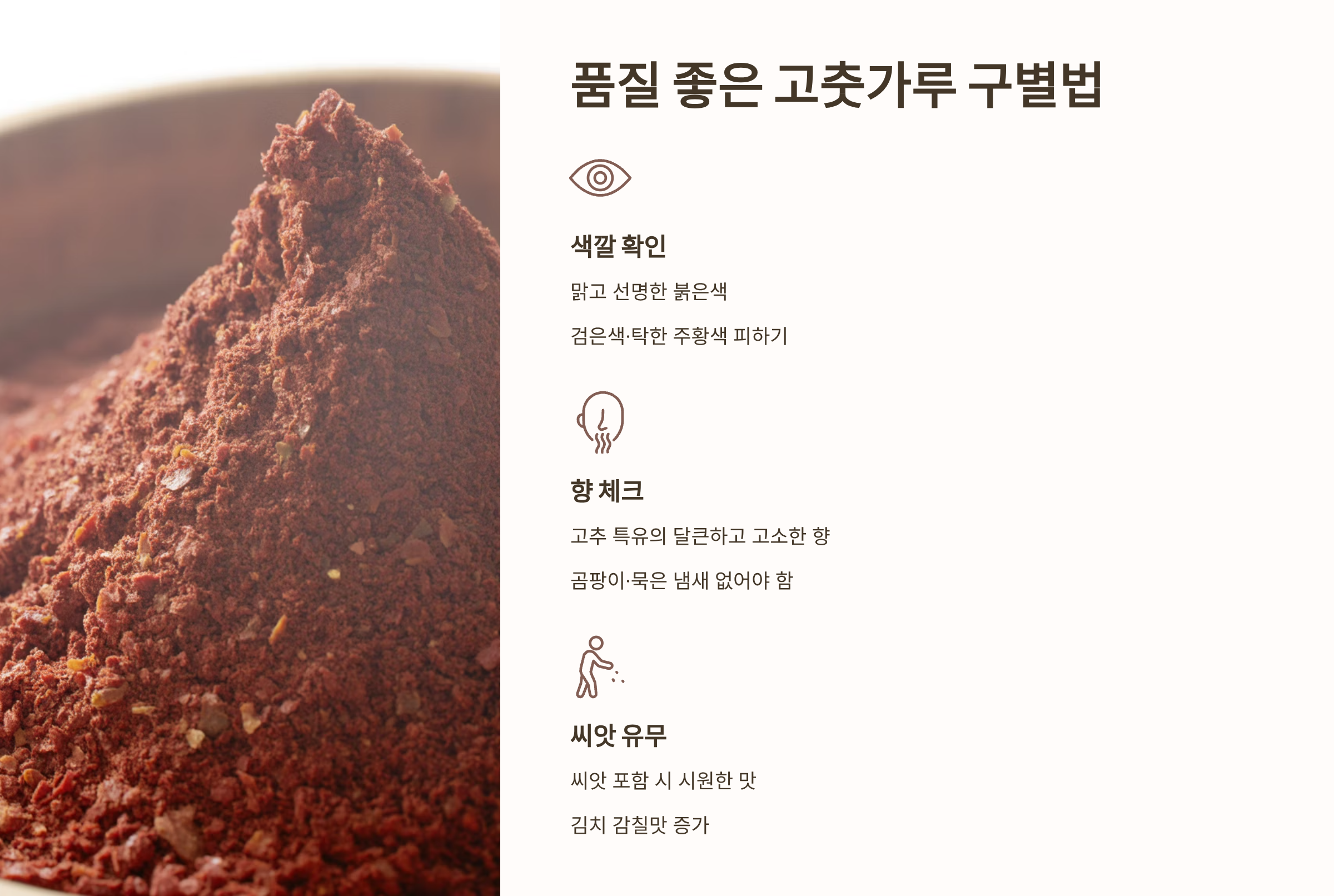 - 향: 곰팡이 냄새나 묵은 냄새 없이, 고추 특유의 달큰하고 고소한 향이 나야 신선합니다.
