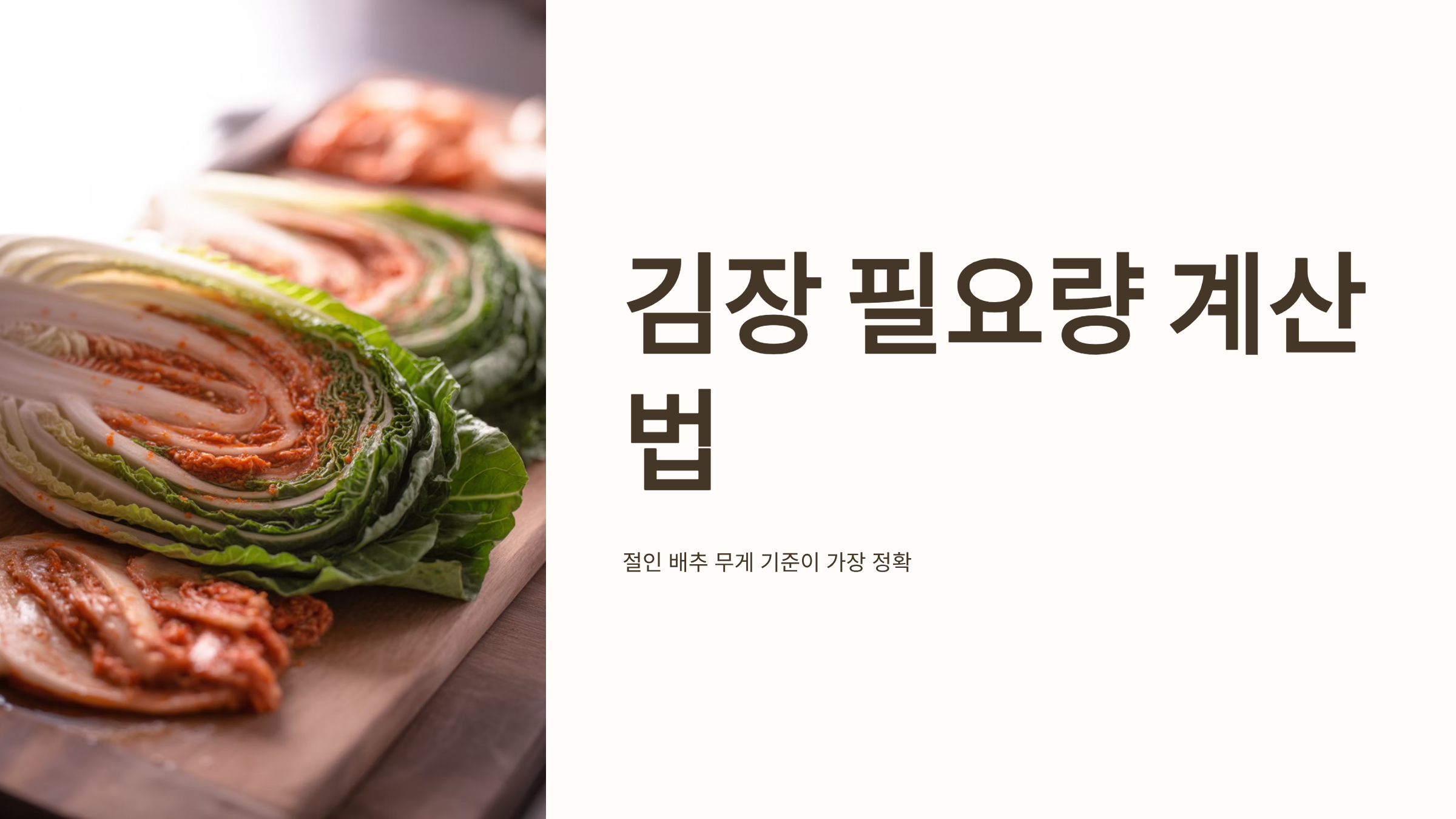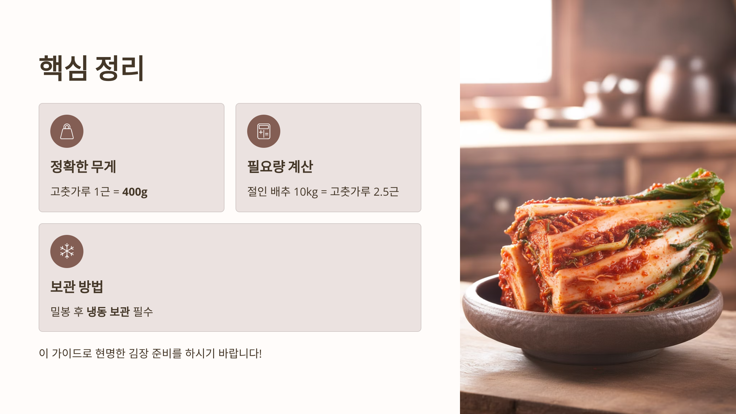 - 필요량 계산 기준: 김장 양념의 양은 절인 배추의 무게를 기준으로 계산하는 것이 가장 정확합니다. (배추 포기 크기가 일정하지 않으므로 포기 수 기준은 부정확함)