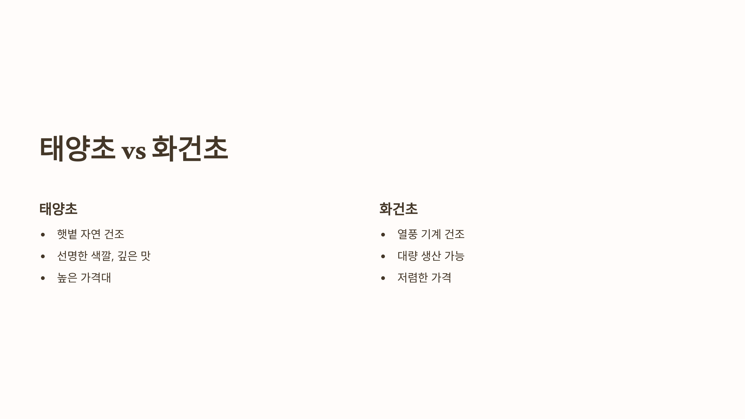 - 건조 방식 (태양초 vs 화건초):