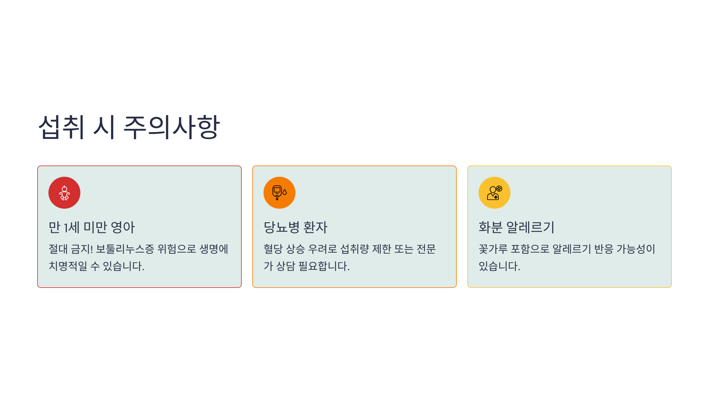 - 만 1세 미만 영아: 절대로 꿀을 먹여서는 안 됩니다. 꿀에는 클로스트리디움 보툴리눔(Clostridium botulinum) 박테리아의 포자가 포함될 수 있으며, 성인의 장에서는 제거되지만, 면역 체계가 미숙한 영아에게는 영아 보툴리누스증이라는 치명적인 신경 마비 질환을 유발할 수 있습니다. 반드시 만 12개월 이후부터 섭취해야 합니다.