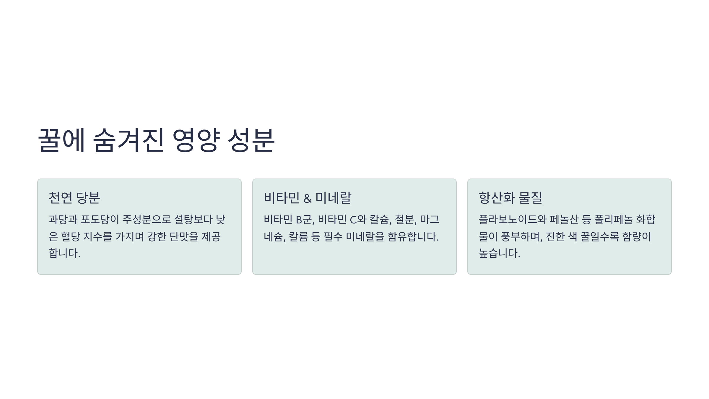 이러한 천연 당분과 미량 영양소의 조화 덕분에 꿀은 설탕처럼 급격한 혈당 스파이크를 유발하지 않으면서도 에너지를 공급하는 좋은 천연 에너지원이 될 수 있습니다.