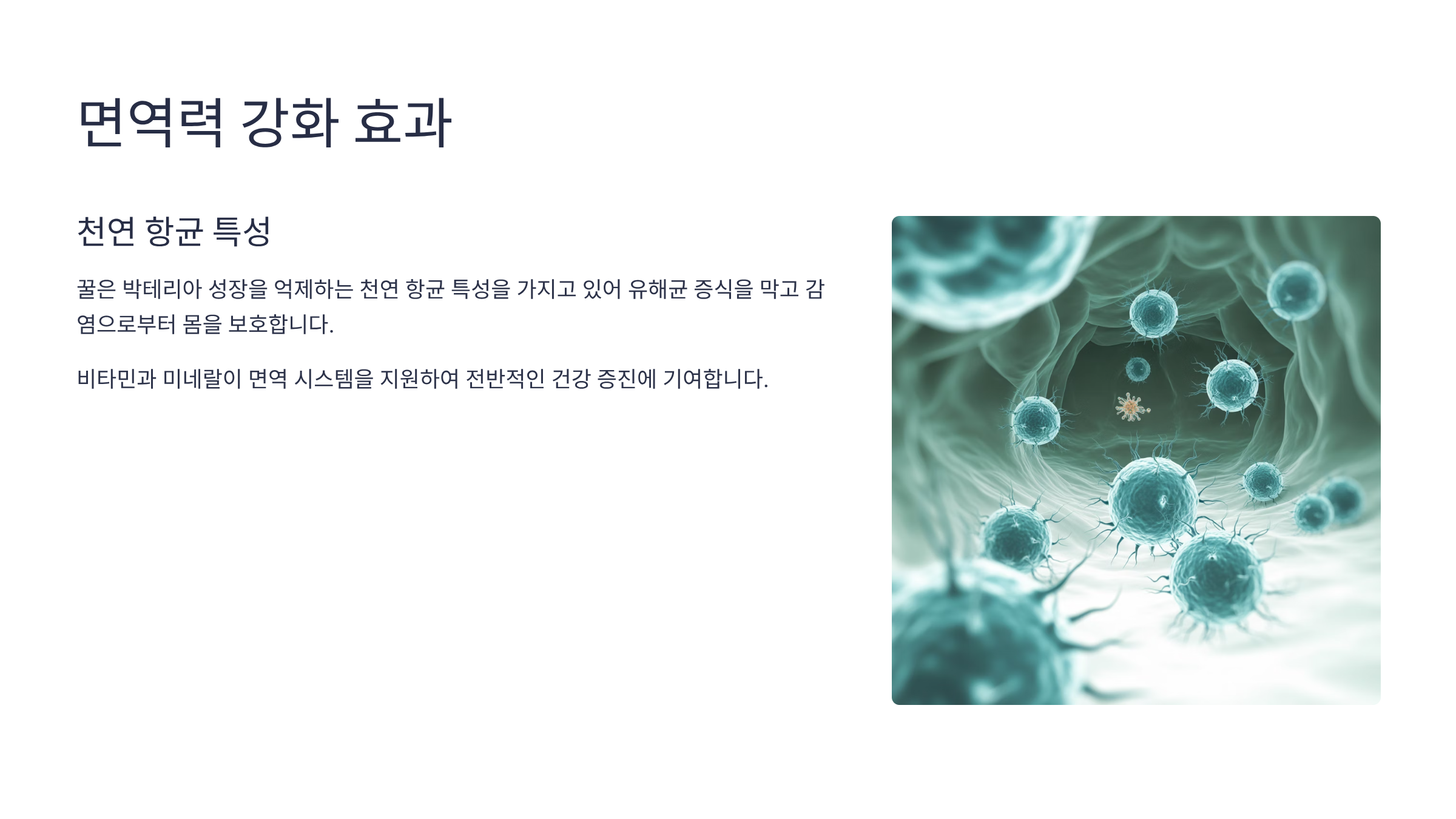 꿀의 효능 중 가장 주목받는 것은 면역 체계를 지원하고 체내 염증 반응을 조절하는 능력입니다.