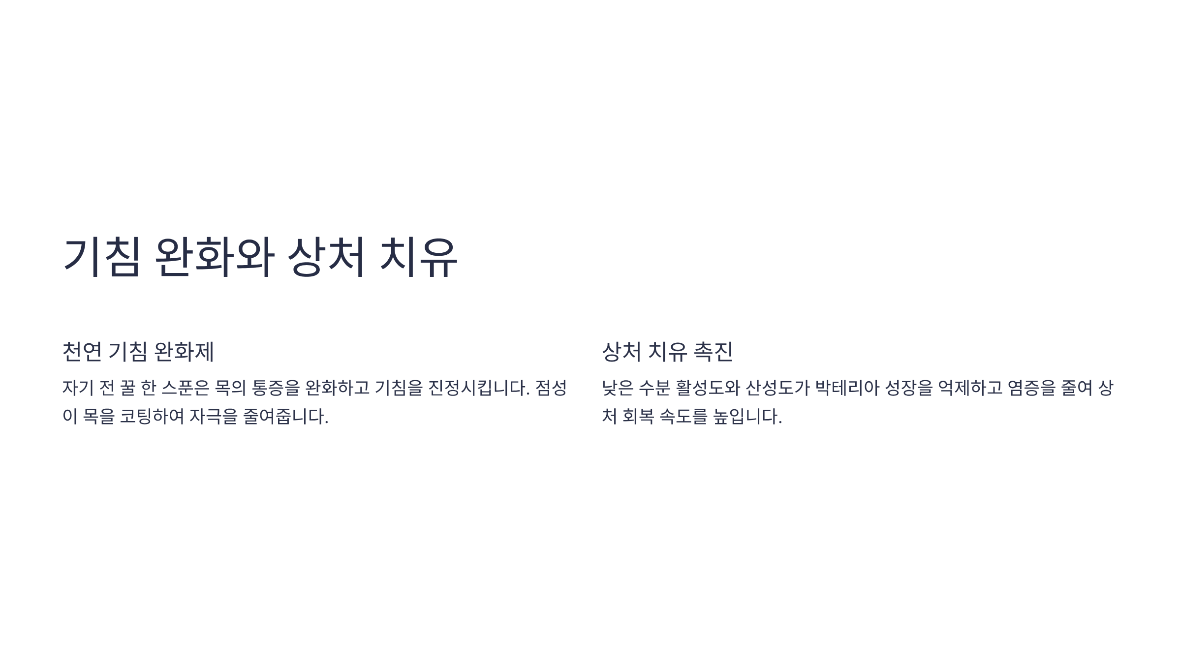 - 천연 기침 완화제: 특히 자기 전 꿀 한 스푼은 목의 통증을 완화하고 기침을 진정시키는 데 효과적이라는 연구 결과가 많습니다. 꿀의 점성이 목을 코팅하여 자극을 줄여주며, 그 성분이 신경 반사를 약화시켜 기침을 억제하는 작용을 합니다. 감기나 독감으로 인한 인후염 증상 완화에 큰 도움을 줍니다.