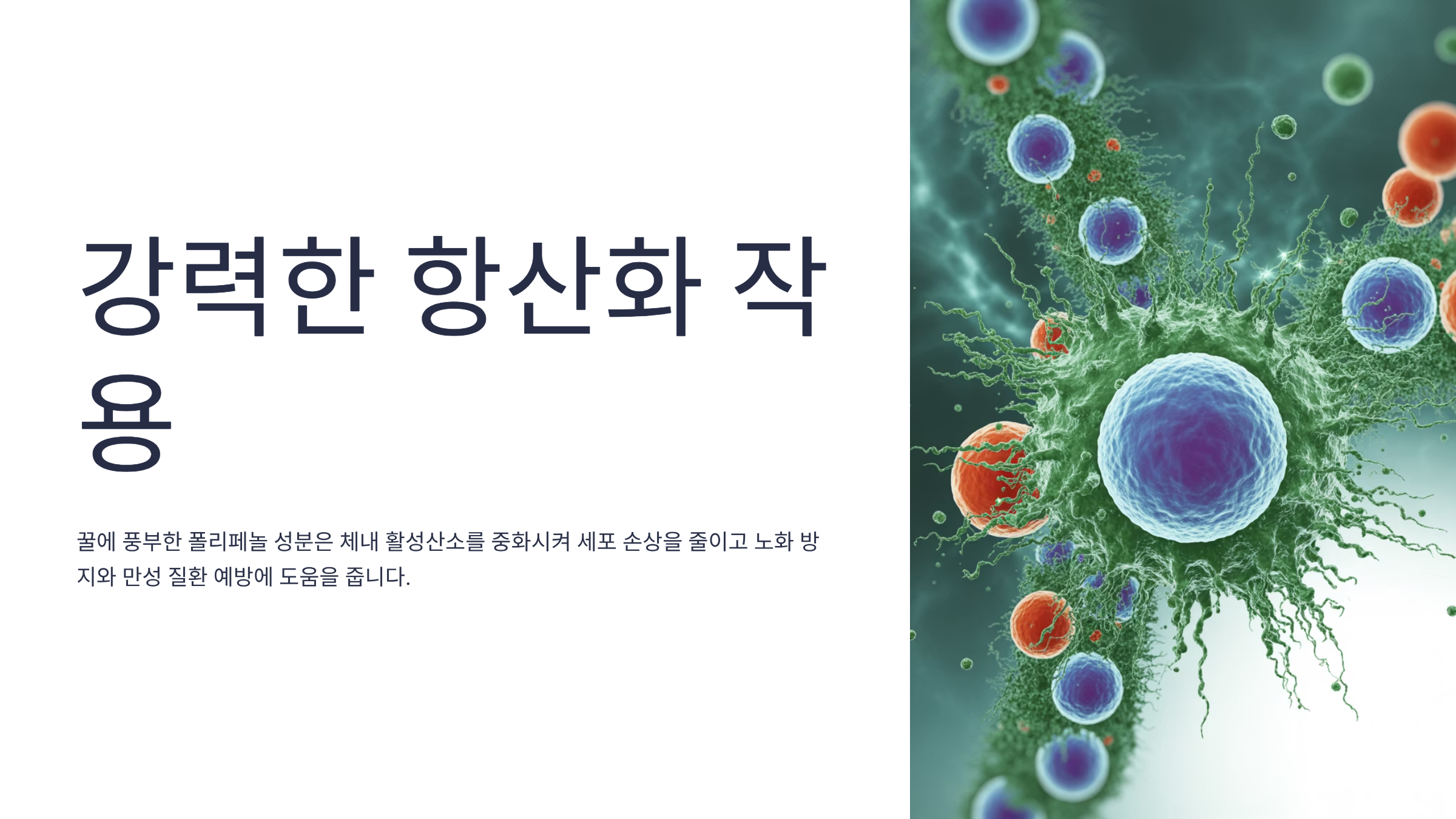 - 강력한 항산화 작용: 꿀에 풍부한 폴리페놀 성분은 체내의 활성산소를 중화시키는 데 도움을 줍니다. 활성산소는 노화와 만성 질환의 주요 원인이 되는데, 꿀을 꾸준히 섭취하면 세포 손상을 줄여 전반적인 건강 유지와 노화 방지에 기여할 수 있습니다.