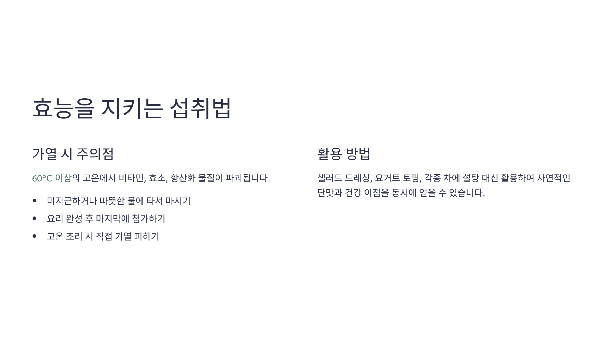 - 효능을 유지하는 섭취법 (가열 주의): 꿀에 함유된 비타민, 효소, 항산화 물질 등의 유효 성분은 열에 약합니다. 특히 60°C 이상의 고온에 노출되면 이로운 효소들이 파괴될 수 있습니다. 따라서 꿀차를 마실 때도 뜨거운 물보다는 미지근하거나 따뜻한 정도의 물에 타서 마시는 것이 꿀의 영양을 최대한 살리는 방법입니다.