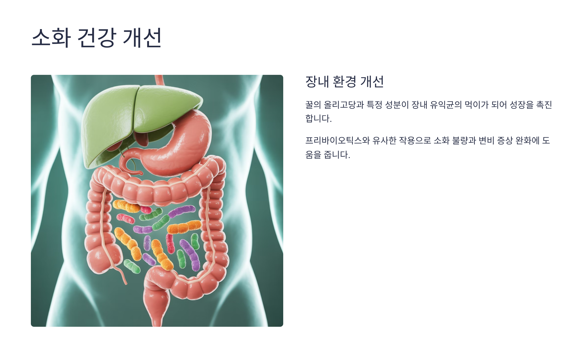 - 소화기 건강 개선: 꿀은 프리바이오틱스(Prebiotics)와 유사한 작용을 합니다. 꿀에 포함된 올리고당과 특정 성분은 장내 유익균의 먹이가 되어 이들의 성장을 촉진하고 장내 환경을 건강하게 유지하는 데 도움을 줄 수 있습니다. 이로 인해 소화 불량이나 변비 증상 완화에 간접적인 효과를 기대할 수 있습니다.