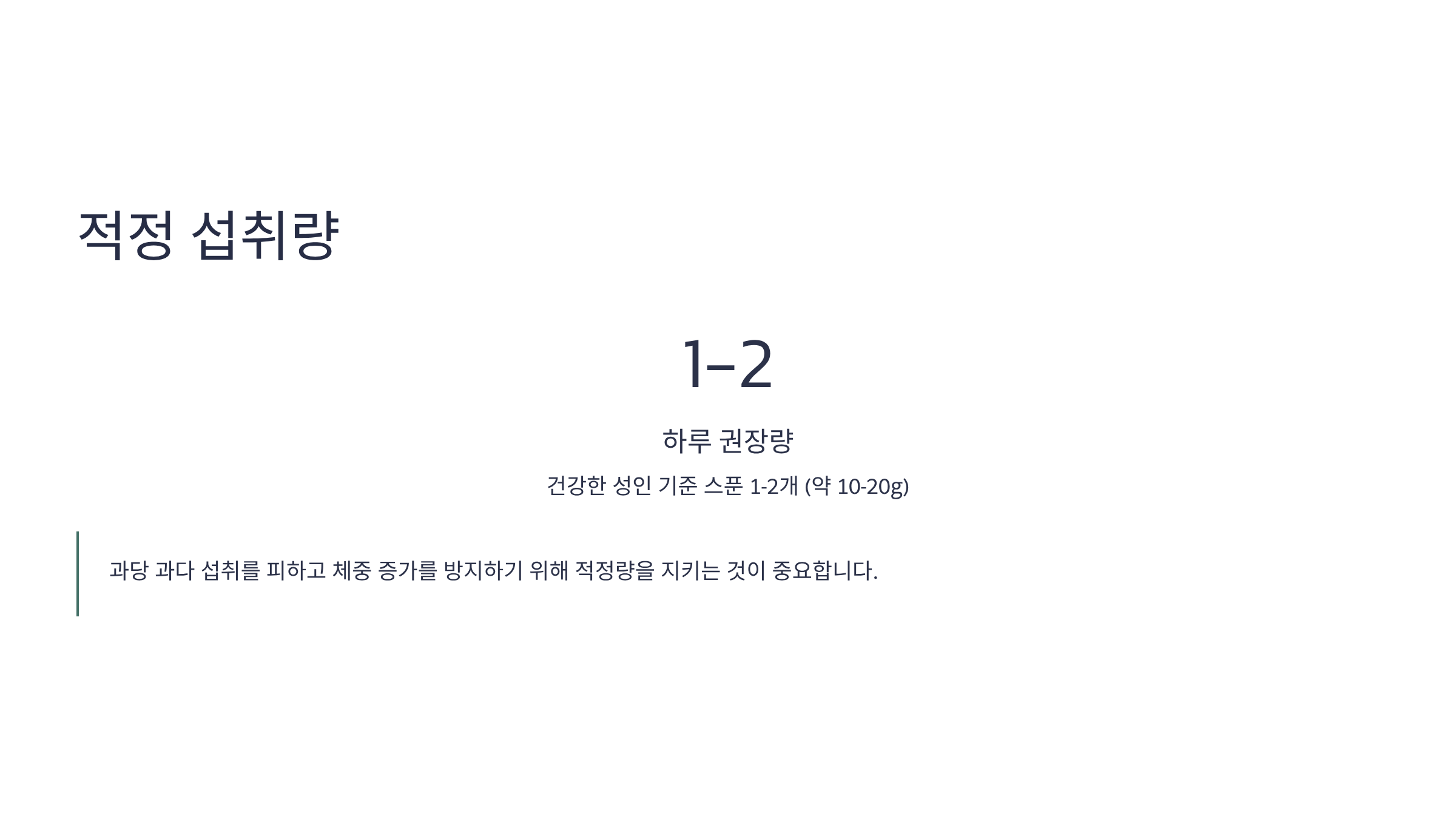 일일 적정 섭취량: 건강한 성인의 경우, 과당 과다 섭취를 피하기 위해 하루 1~2 스푼(약 10~20g) 이내로 섭취하는 것이 권장됩니다. 모든 당분은 과도할 경우 체중 증가와 건강 문제를 유발할 수 있습니다.