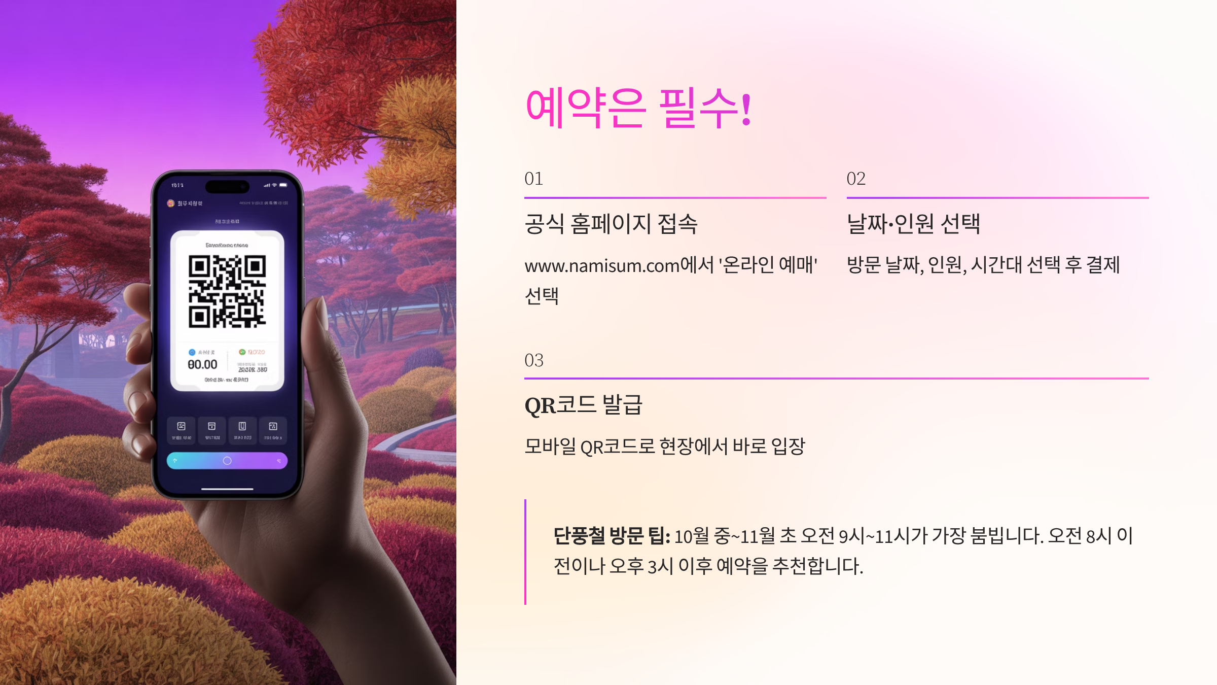 남이섬은 당일 현장 발권도 가능하지만, 주말이나 단풍철에는 예약이 필수다.