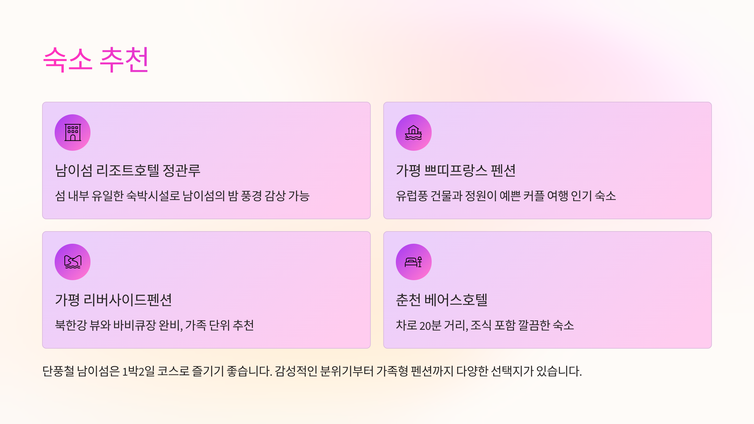 - 가평 리버사이드펜션 : 북한강이 한눈에 보이는 뷰와 바비큐장 완비, 가족 단위 숙박객에게 추천.