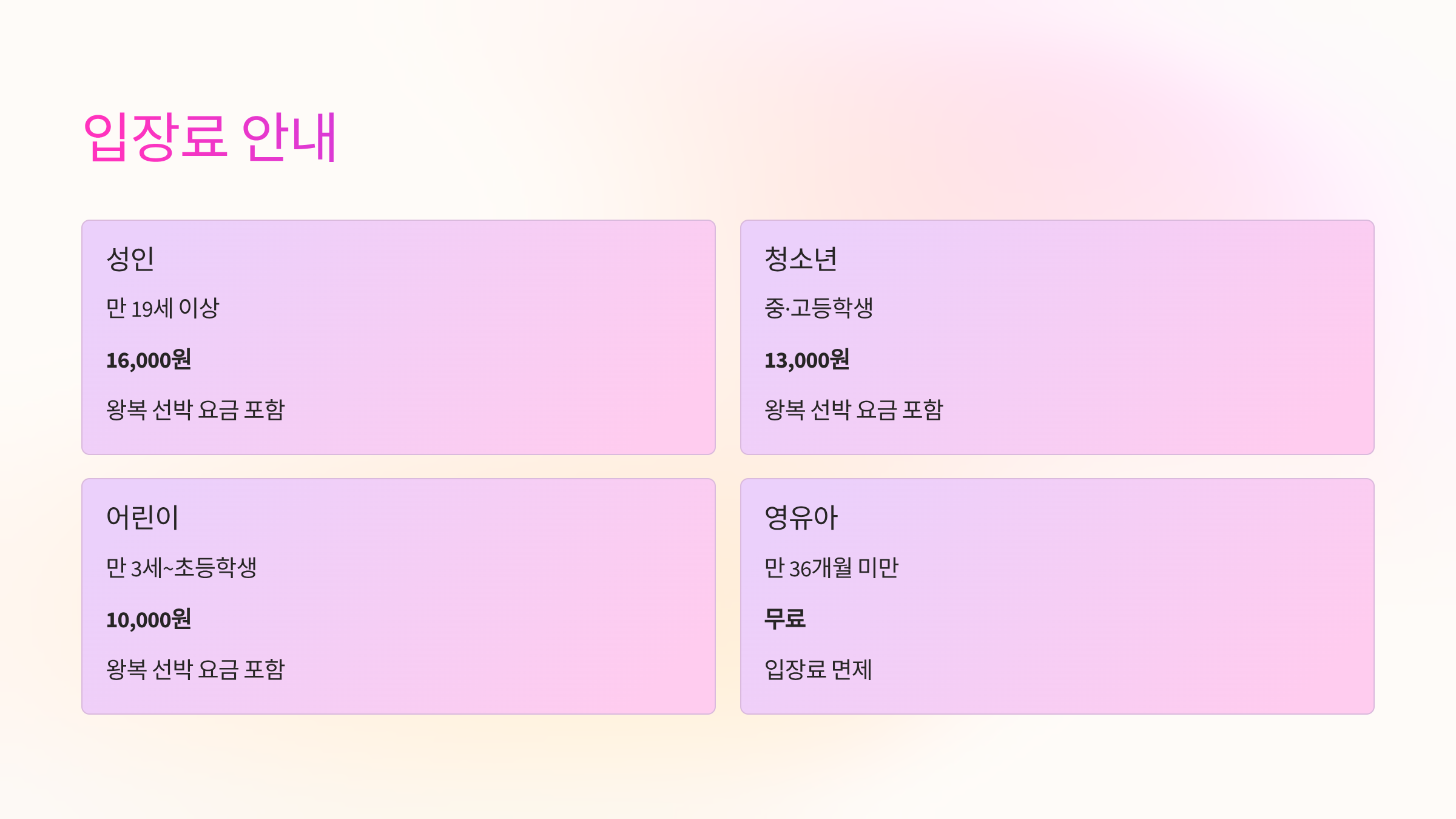- 이용요금 : 성인·청소년 49,000원 (입장료 + 선박 요금 포함)