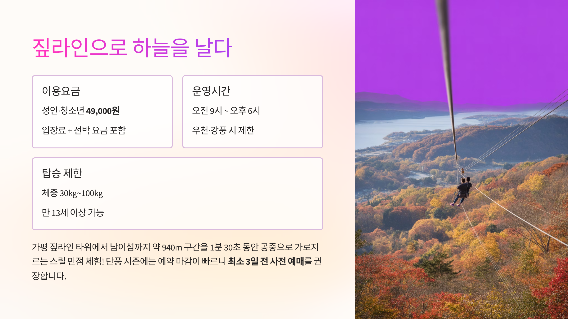 4️⃣ 짚라인 이용 시 남이섬 입장료 포함 패키지를 이용하면 더 저렴하게 입장 가능