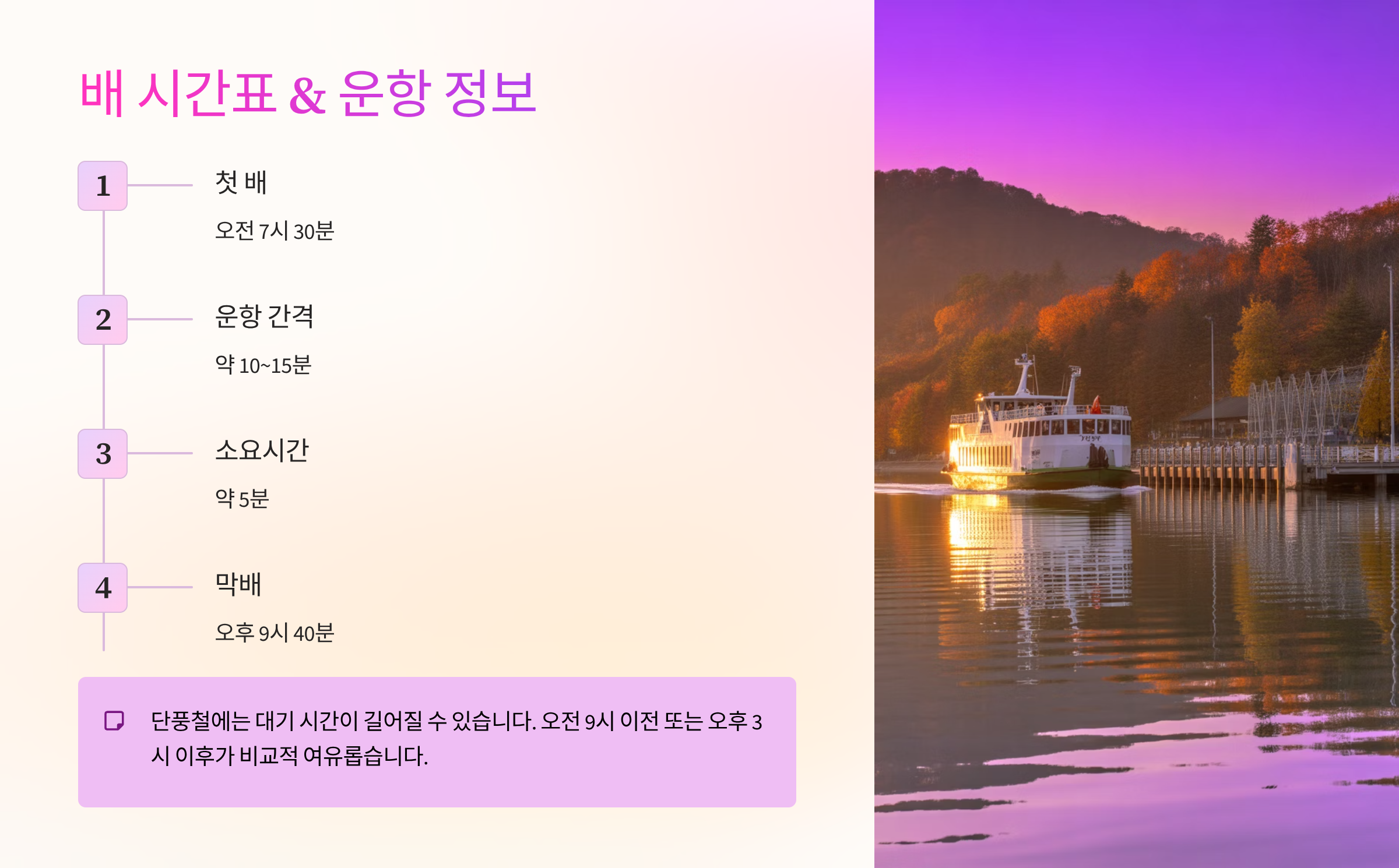 - 운항시간 : 오전 7시 30분 ~ 오후 9시 40분