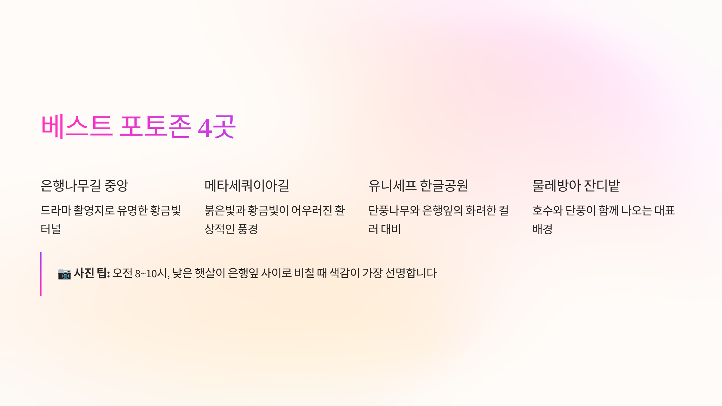 팁 : 오전 8~10시 사이, 낮은 햇살이 은행잎 사이로 비칠 때 사진 색감이 가장 선명하다.