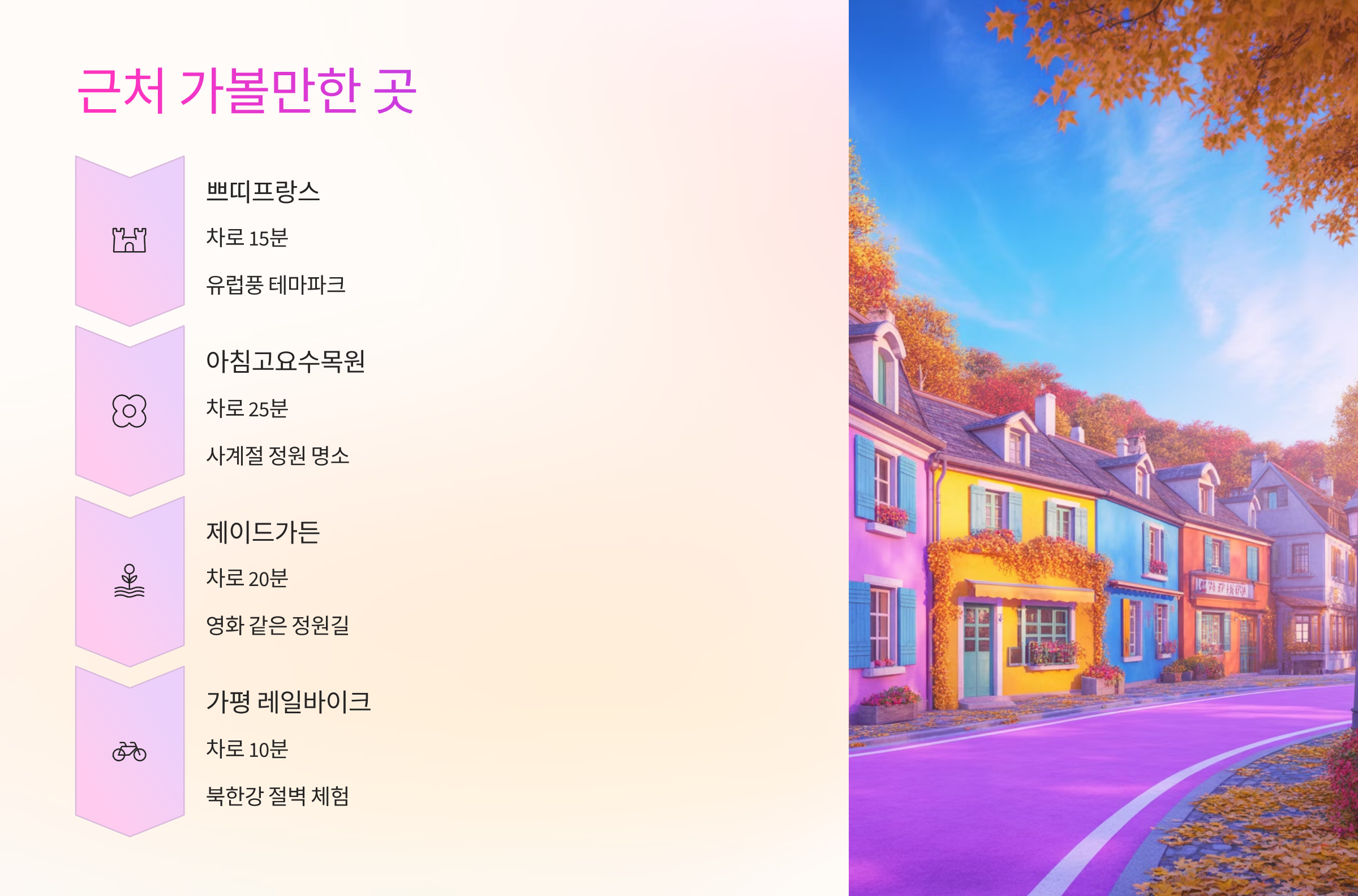 - 가평 레일바이크 (차로 10분) : 북한강 절벽 위를 달리는 체험형 관광지로 가족 단위 추천.