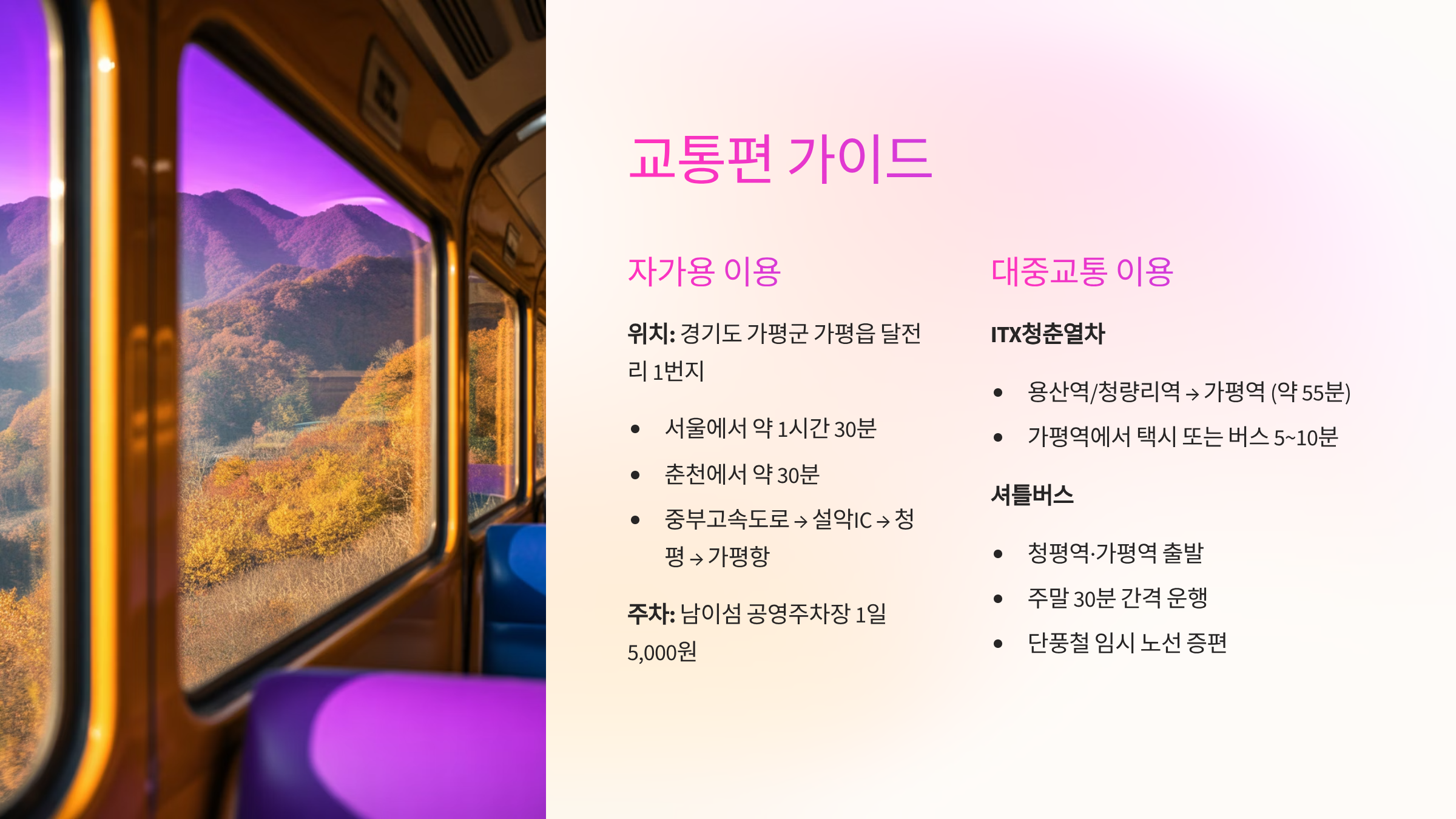 - 또는 ‘남이섬 셔틀버스’(청평역·가평역 출발)를 이용 가능