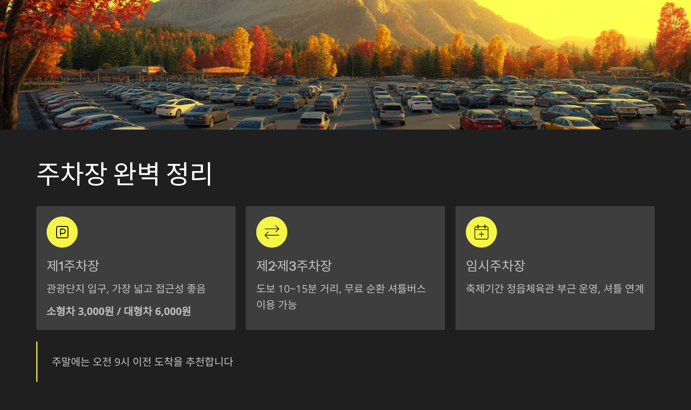 : 가장 넓고 접근성이 좋으며, 단풍축제 기간에는 빠르게 만차가 됩니다.