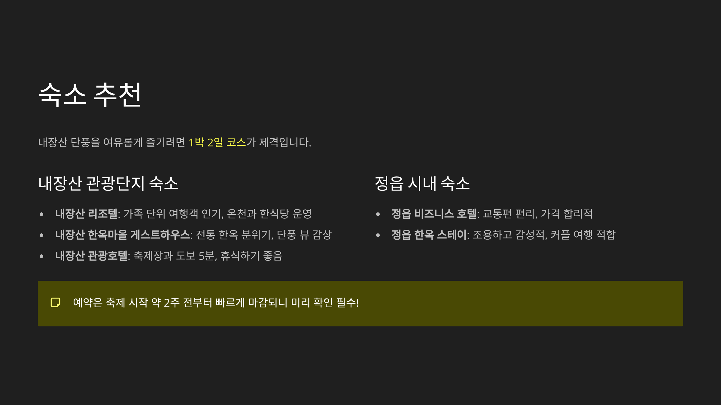 숙소는 내장산관광단지 주변 숙박시설과 정읍 시내권 숙소로 나눌 수 있습니다.