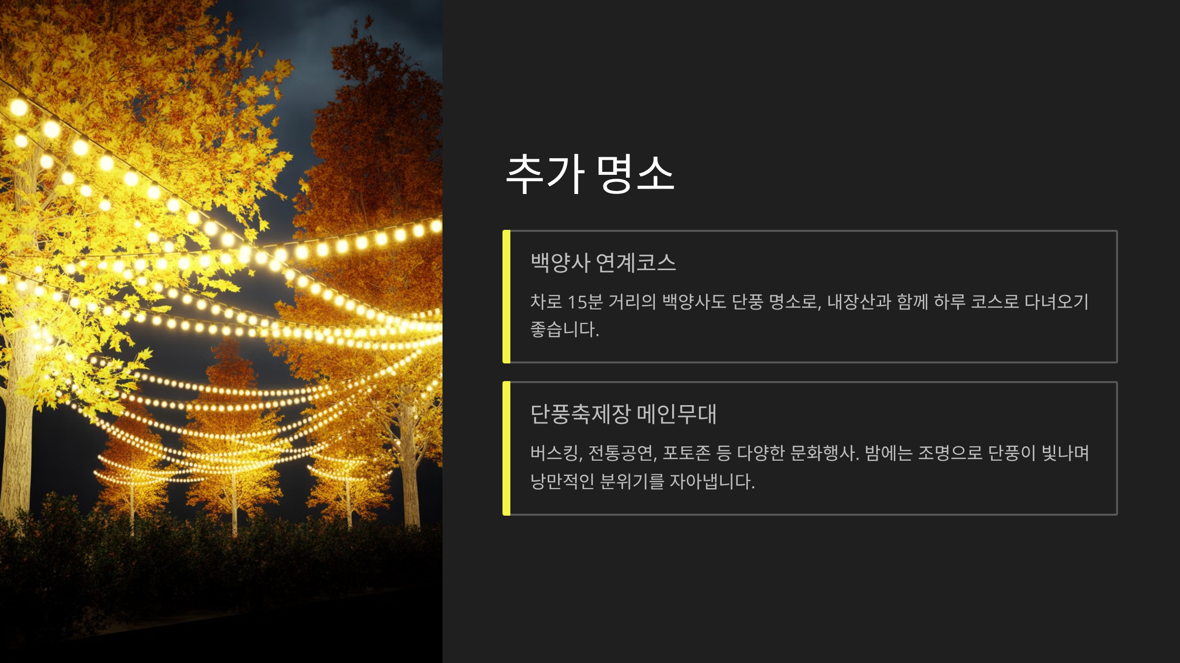 : 차로 15분 거리의 백양사도 단풍 명소로, 내장산과 함께 하루 코스로 다녀오기 좋습니다. - 내장산 단풍축제장 메인무대