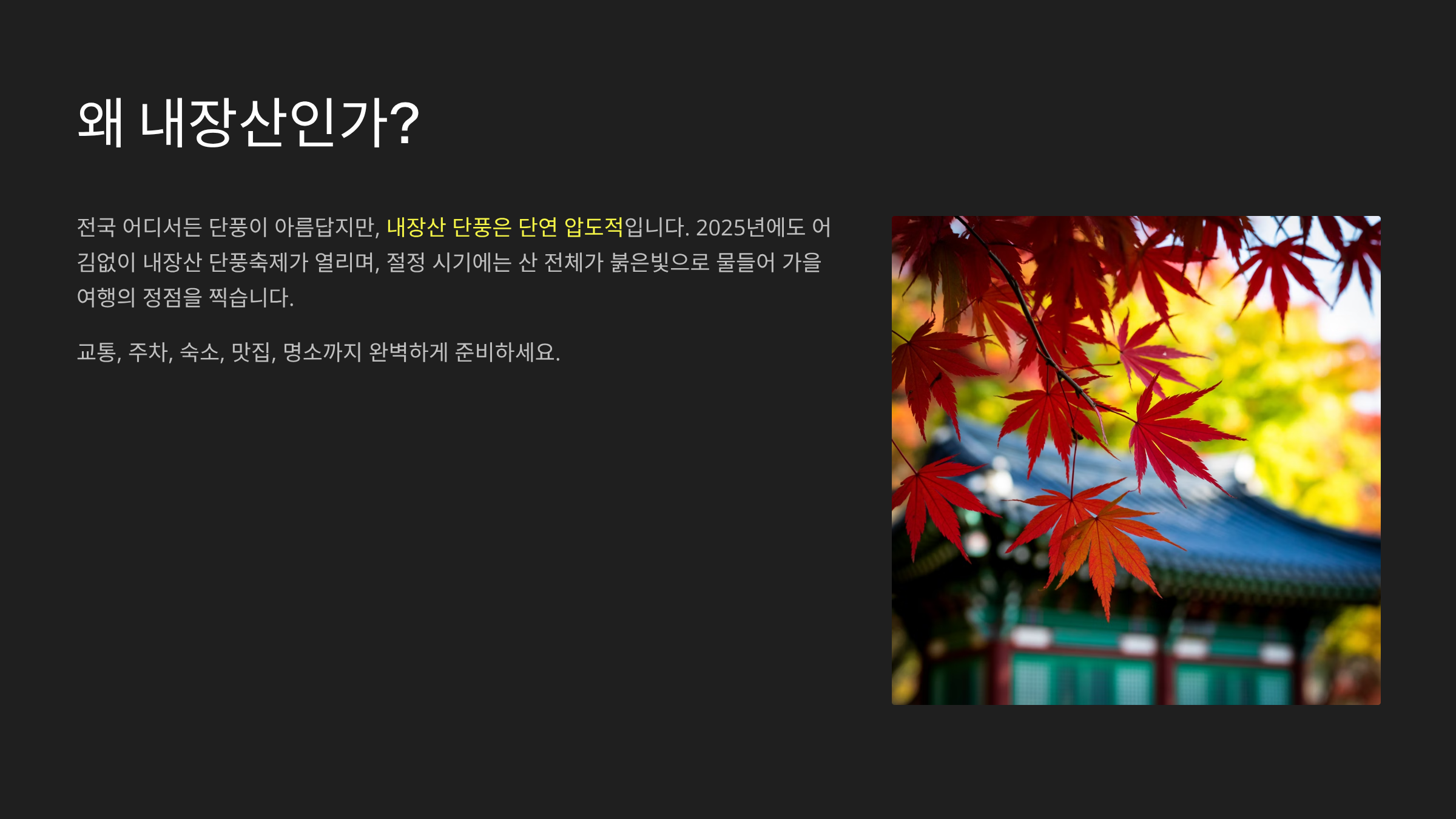 2025년에도 어김없이 내장산 단풍축제가 열리며, 절정 시기에는 산 전체가 붉은빛으로 물들어 가을 여행의 정점을 찍습니다.