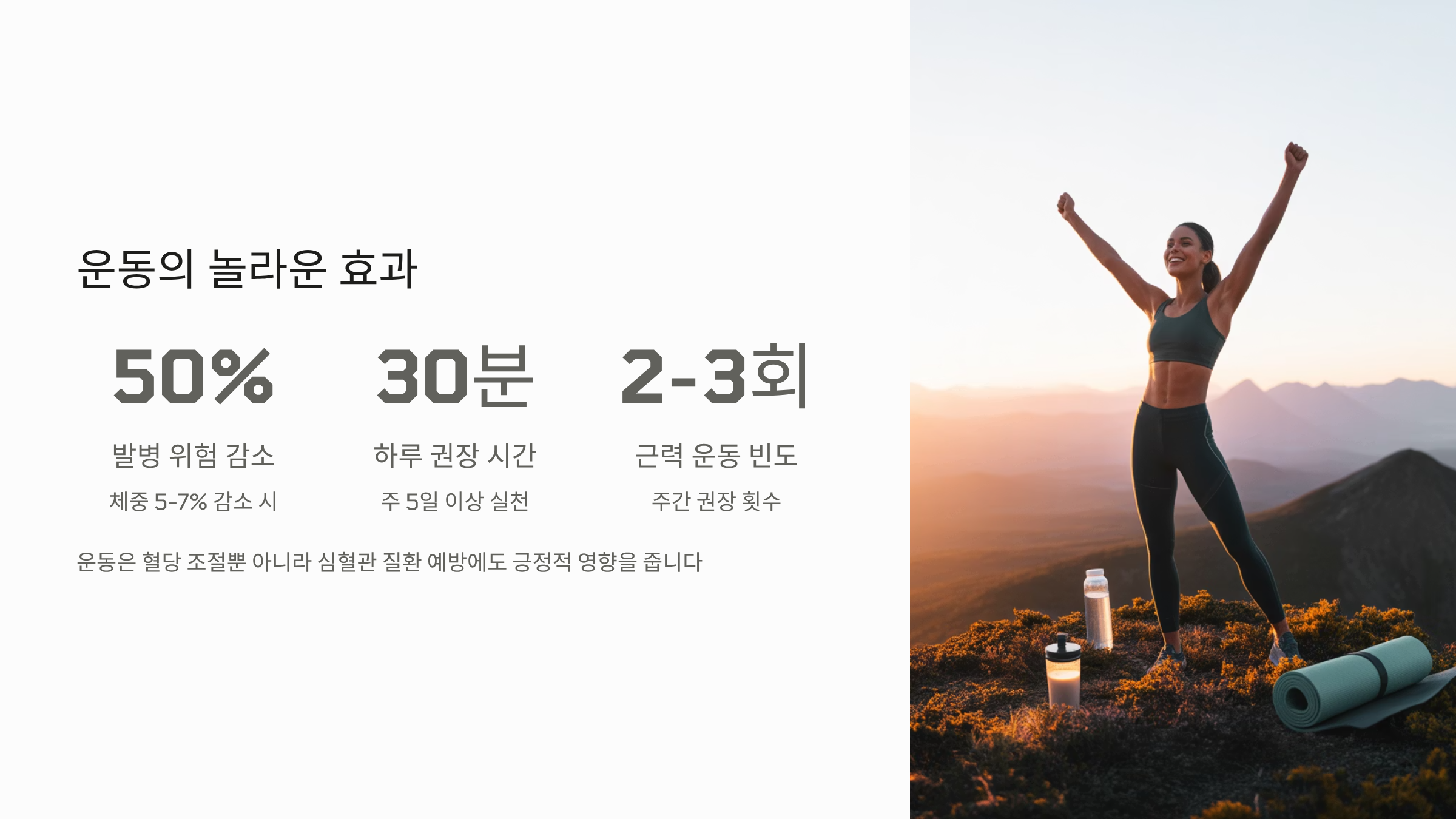 운동은 혈당 값뿐 아니라 체중감소에도 중요하며, 체중 5~7% 감소만으로도 당뇨병 발병 위험을 절반 이상 낮출 수 있다는 것이 여러 연구에서 입증되었습니다. 특히 운동은 심혈관 질환 예방에도 긍정적 영향을 주니 꼼꼼히 챙기셔야 합니다.