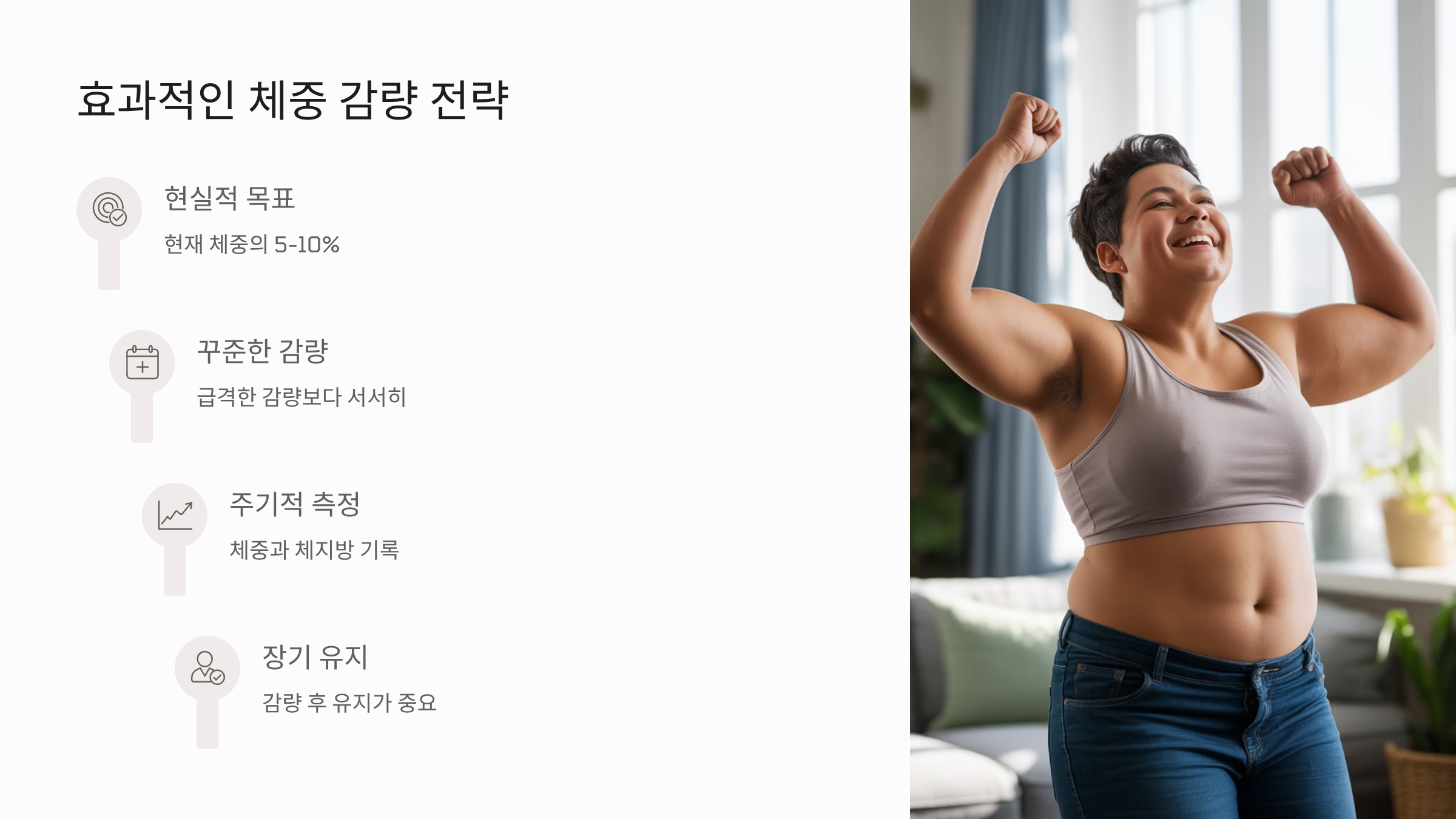 - 급격한 감량보다는 꾸준한 감량과 유지가 장기적으로 중요