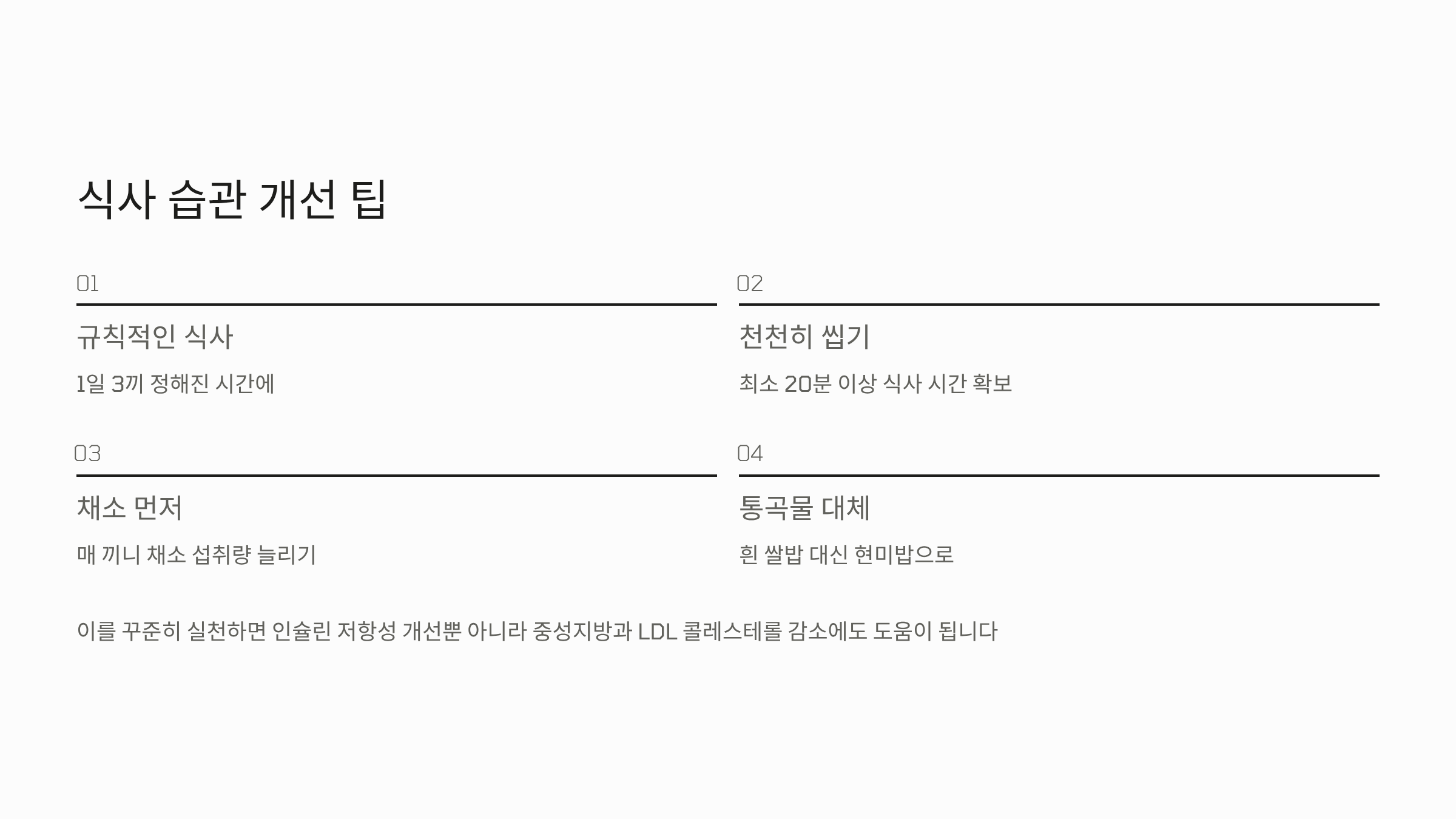 최근 연구에 따르면, 한 끼 식사 때마다 채소 섭취량을 늘리고, 주식은 현미 등 통곡물로 대체하는 것이 인슐린 저항성을 개선하는 효과가 큽니다. 이를 꾸준히 실천할 경우 혈당 조절뿐 아니라 혈중 중성지방과 나쁜 LDL 콜레스테롤 감소에도 도움이 됩니다.