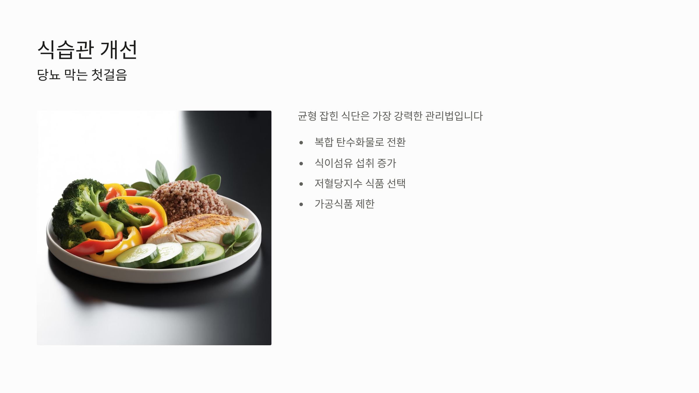 균형 잡힌 식단은 가장 강력한 당뇨 전단계 관리법입니다. 당류와 흰 탄수화물 음식 섭취를 줄이고, 식이섬유와 저혈당지수(GI) 식품을 많이 섭취하세요.
