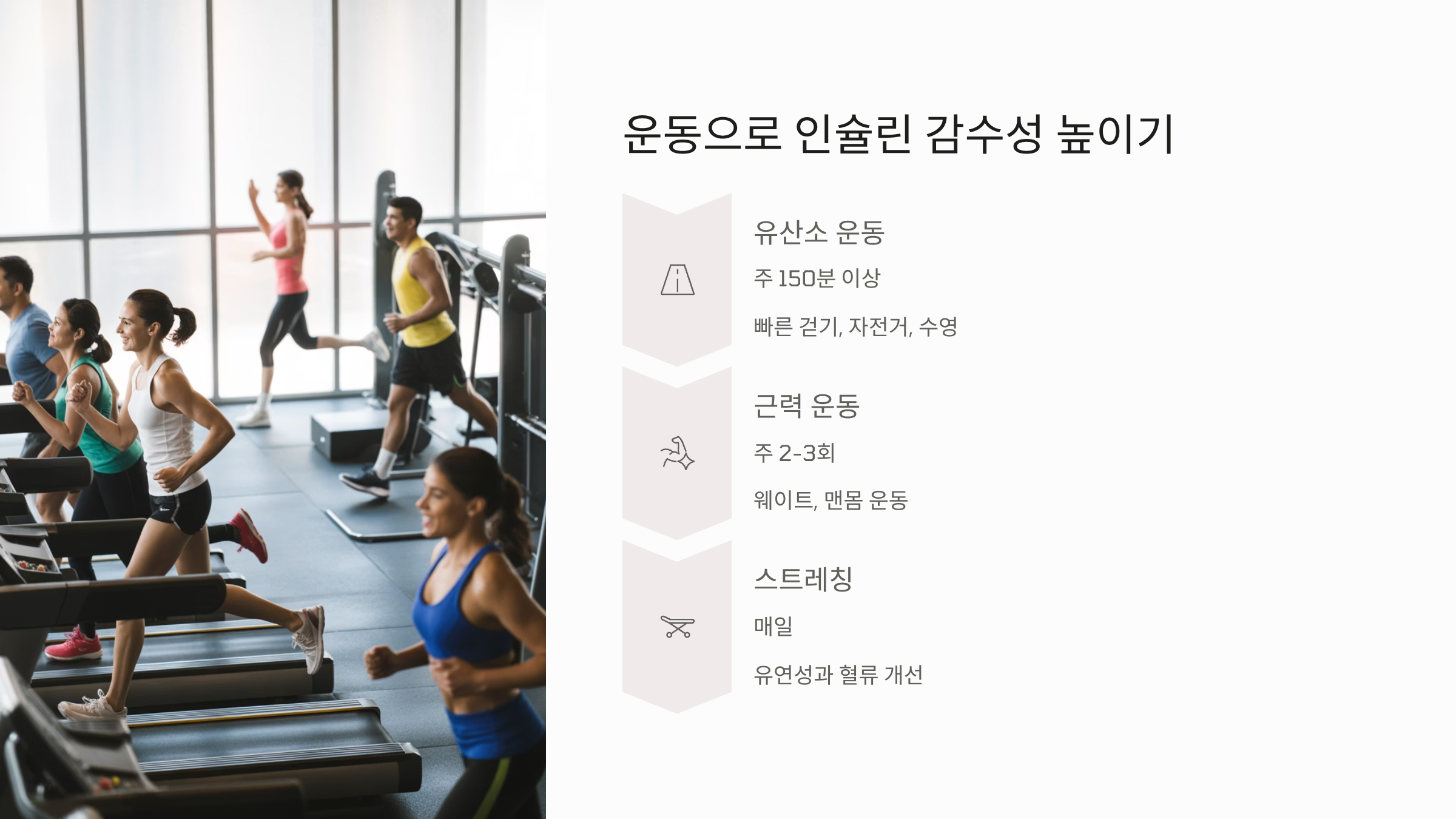 운동은 혈당을 직접 낮추고 인슐린 민감도를 개선하는 최적의 방법입니다. 당뇨 전단계 환자에게 추천되는 운동은 다음과 같습니다.