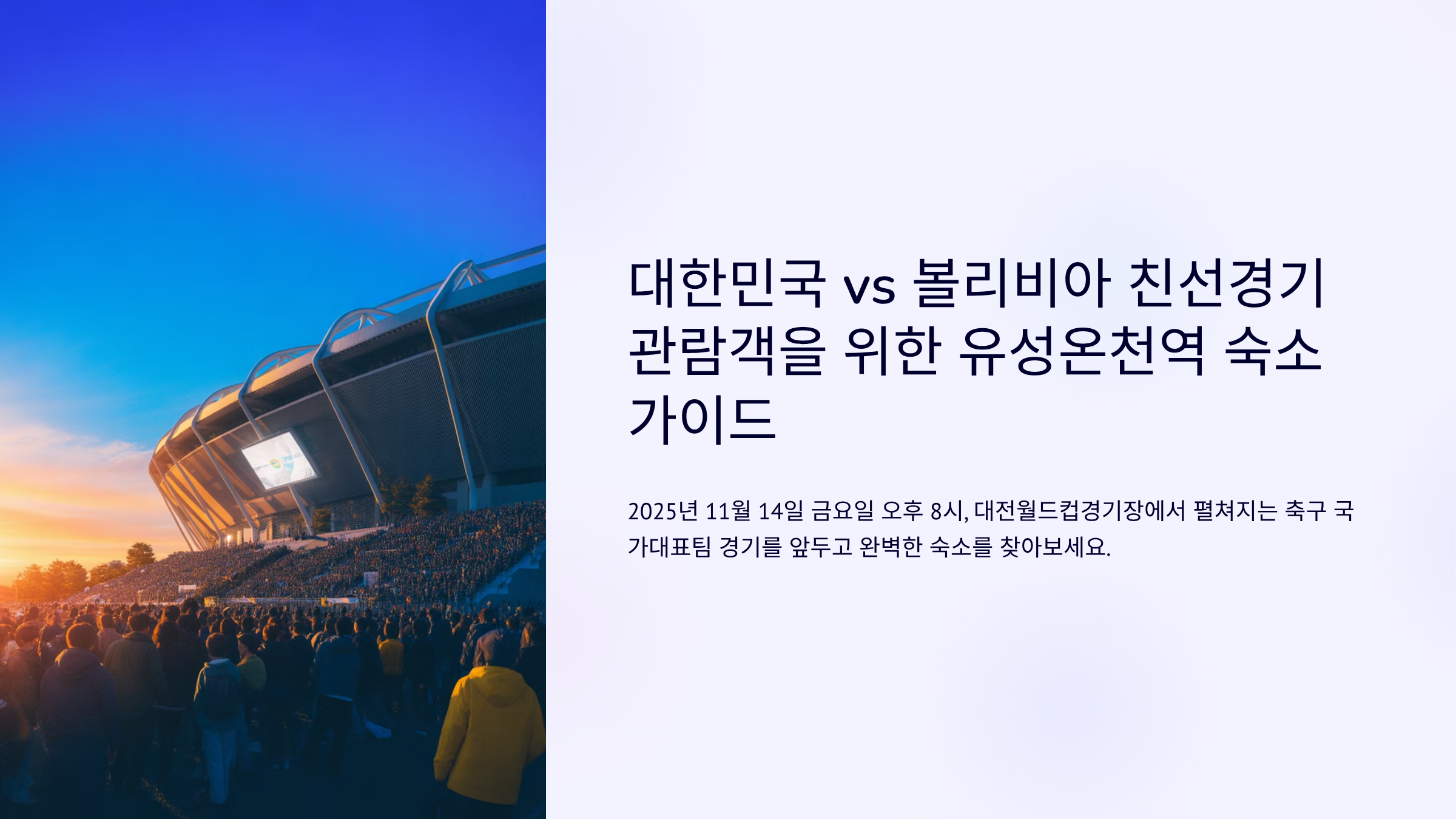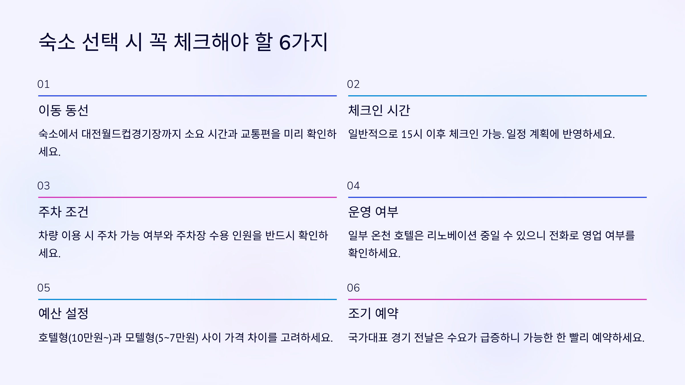 - 이동 동선: 숙소 → 경기장(대전월드컵경기장)까지의 이동 시간을 고려하세요. 숙박 후 늦게 나가느라 긴장되는 일이 없도록.