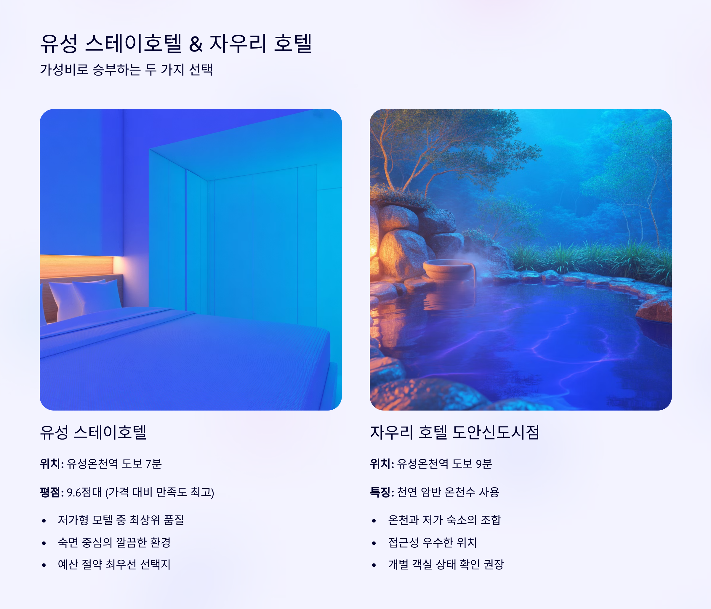 - 특징: 천연 암반 온천수를 사용한다는 안내 있음. 저가형 호텔·모텔 혼합 형태로 접근성 우수.