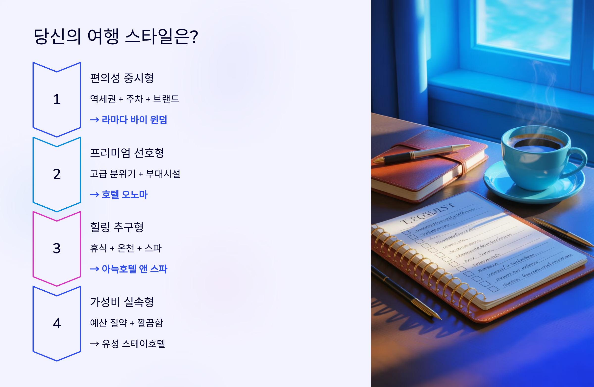 - 고급스러운 분위기 + 부대시설까지 원한다면 → 호텔 오노마