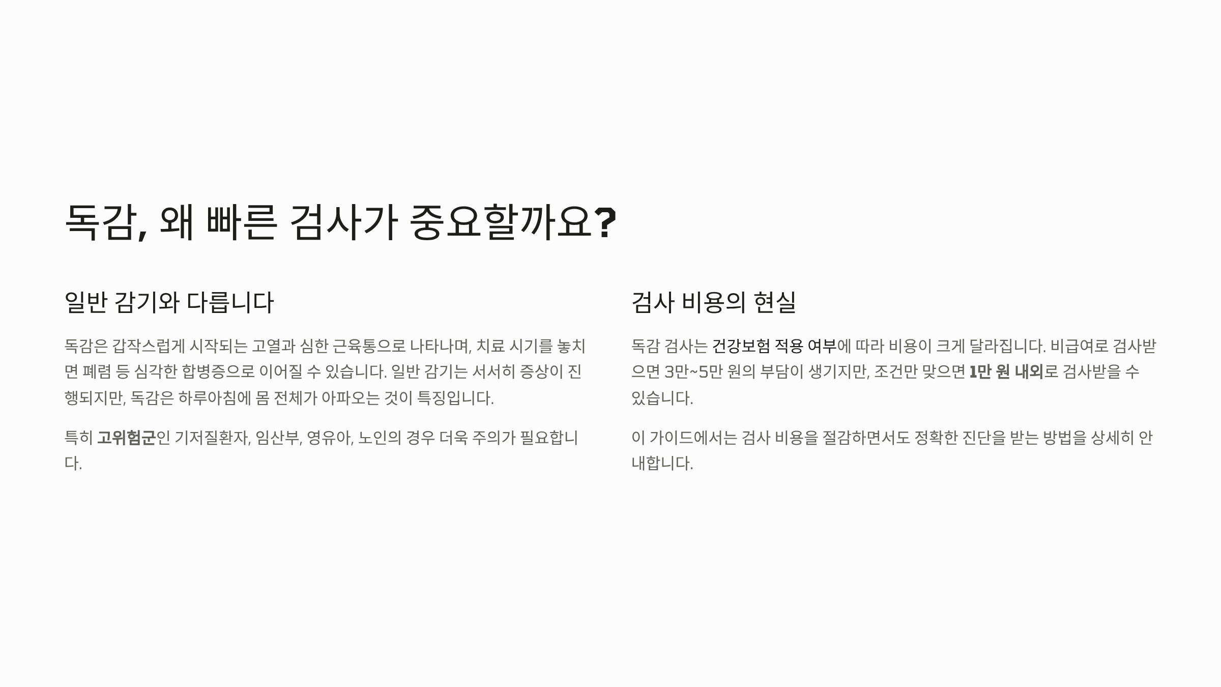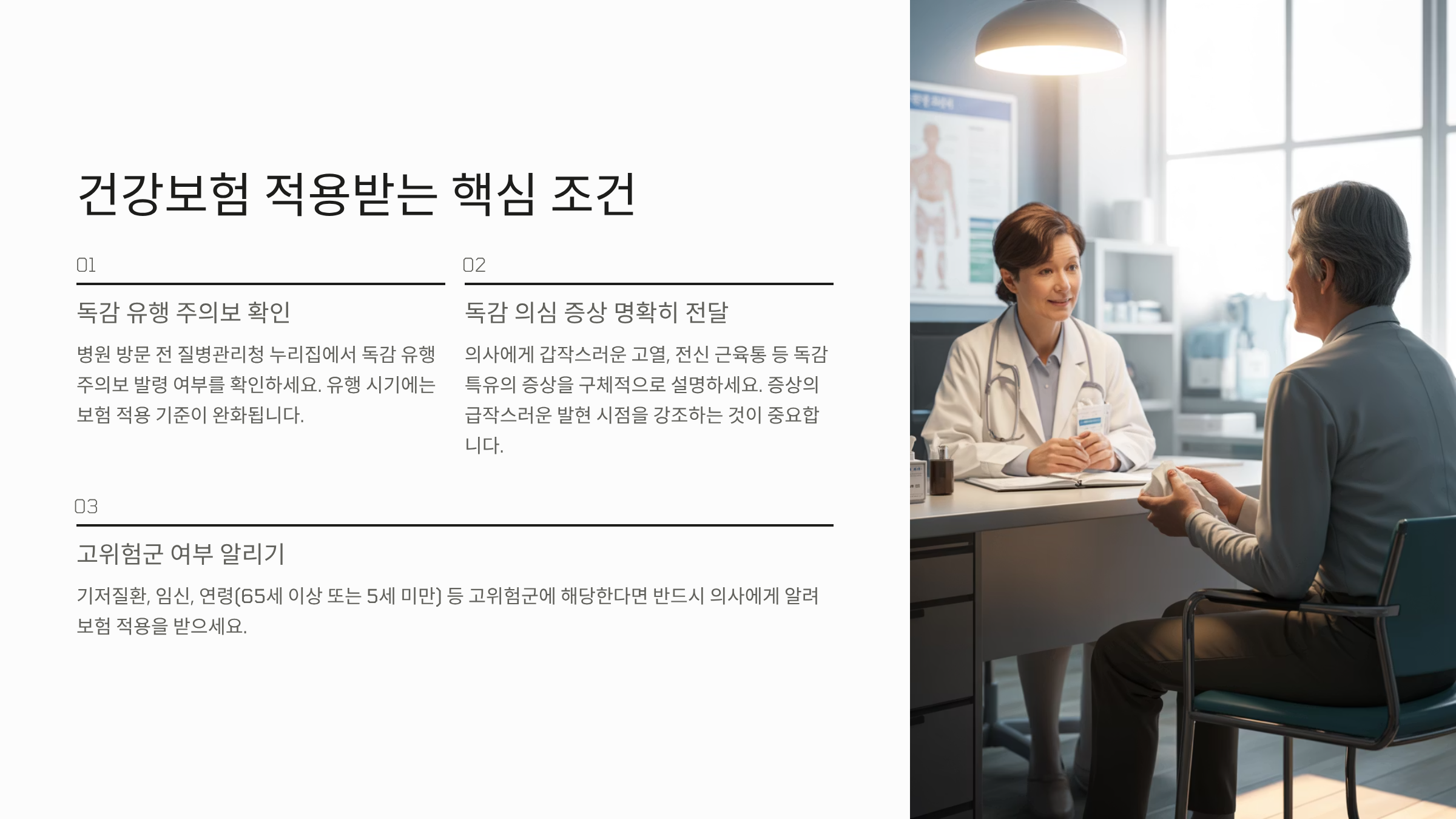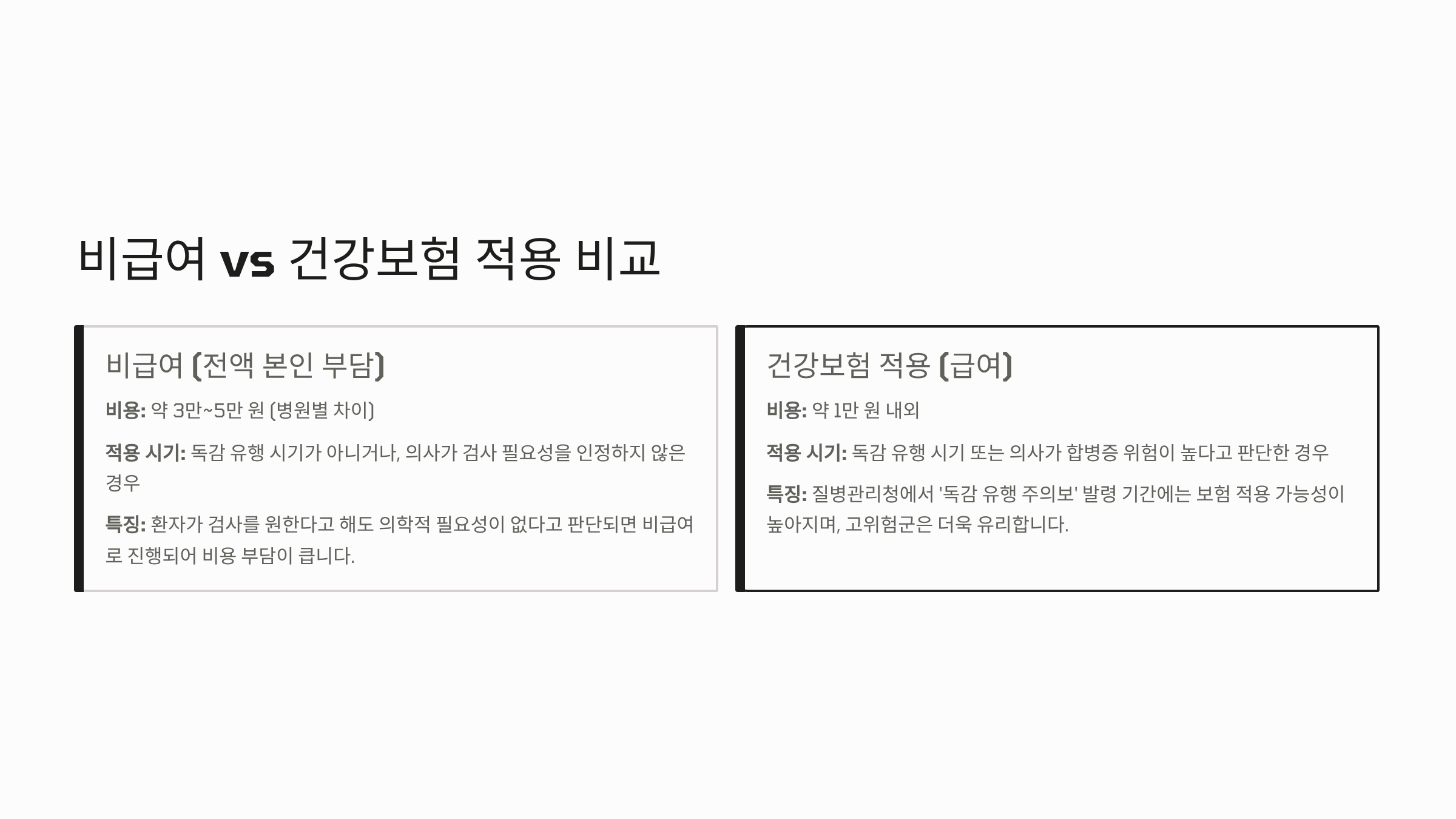 - 비용 절감 노하우: 병원 방문 전 질병관리청 누리집을 통해 독감 유행 주의보 발령 여부를 확인하고, 검사 시 의사에게 독감 고위험군 여부를 명확히 알려야 보험 적용을 받는 데 유리할 수 있습니다.