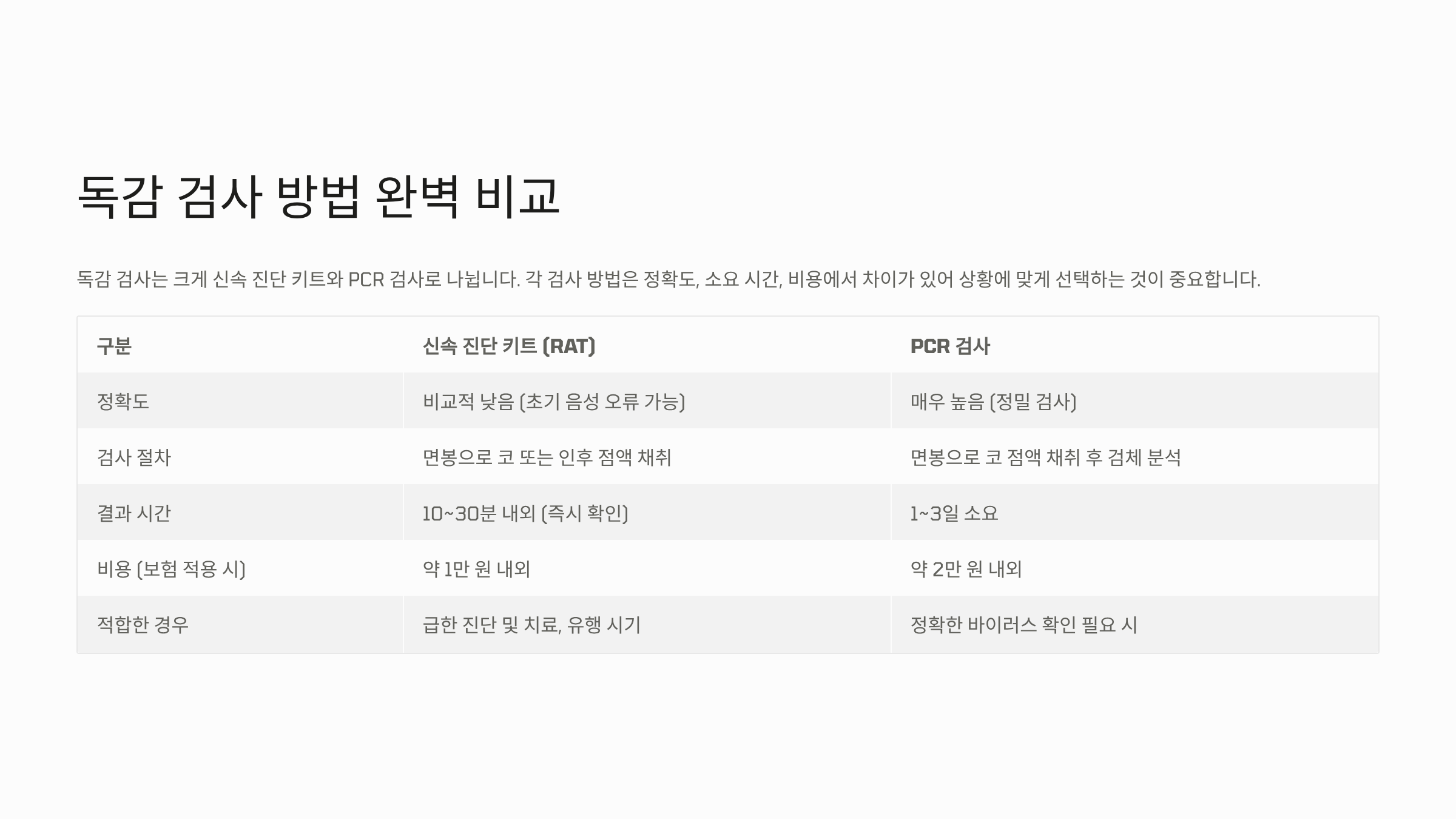 | 검사 방법 | 신속 진단 키트 (RAT) | PCR 검사 (핵산 증폭 검사) |