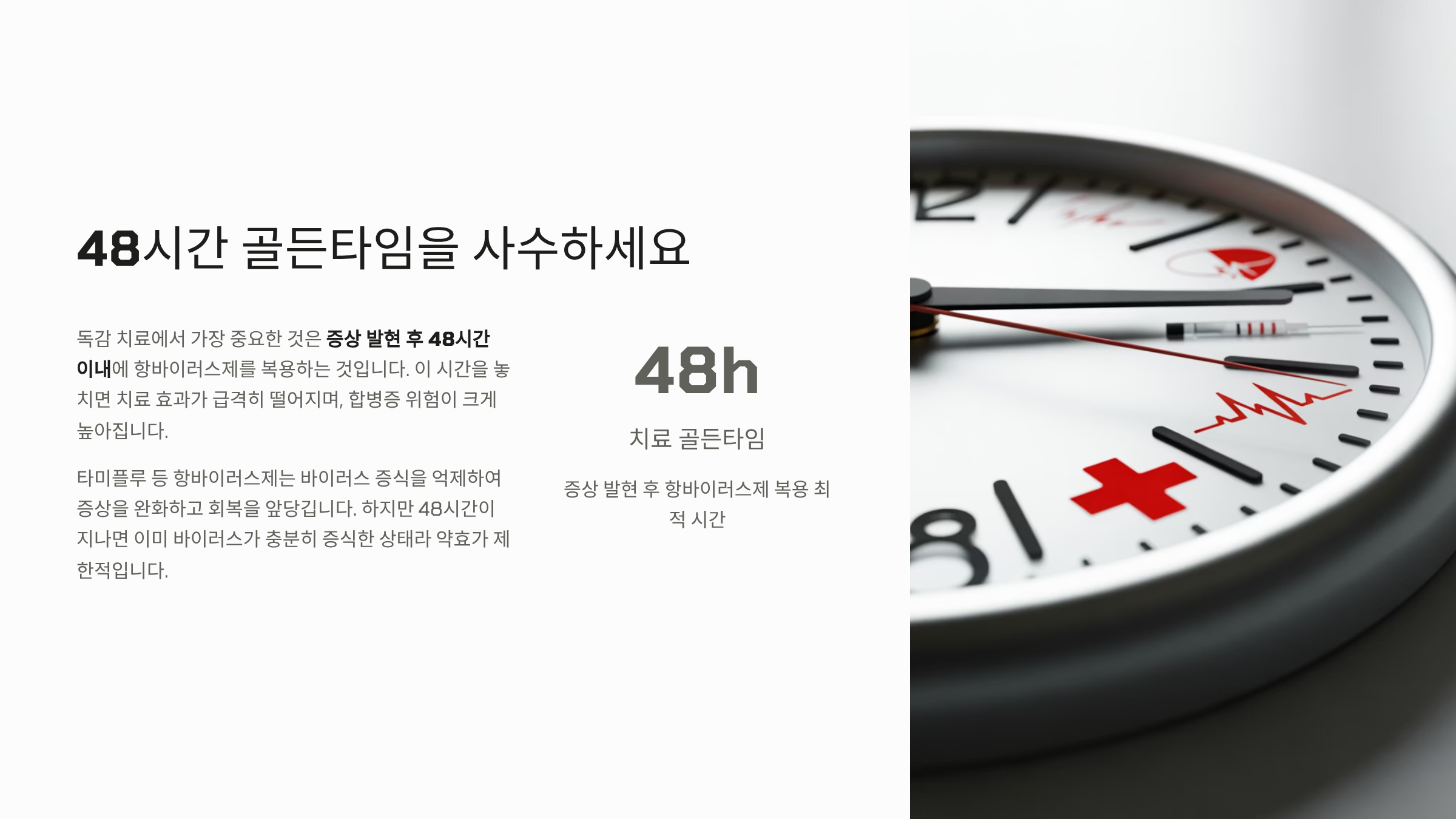 - 48시간 골든타임의 중요성: 독감 치료제인 항바이러스제는 증상이 시작된 지 48시간이 지나면 치료 효과가 급격히 떨어집니다. 따라서 증상이 의심되면 지체 없이 병원을 방문하여 검사를 받아야 합니다.