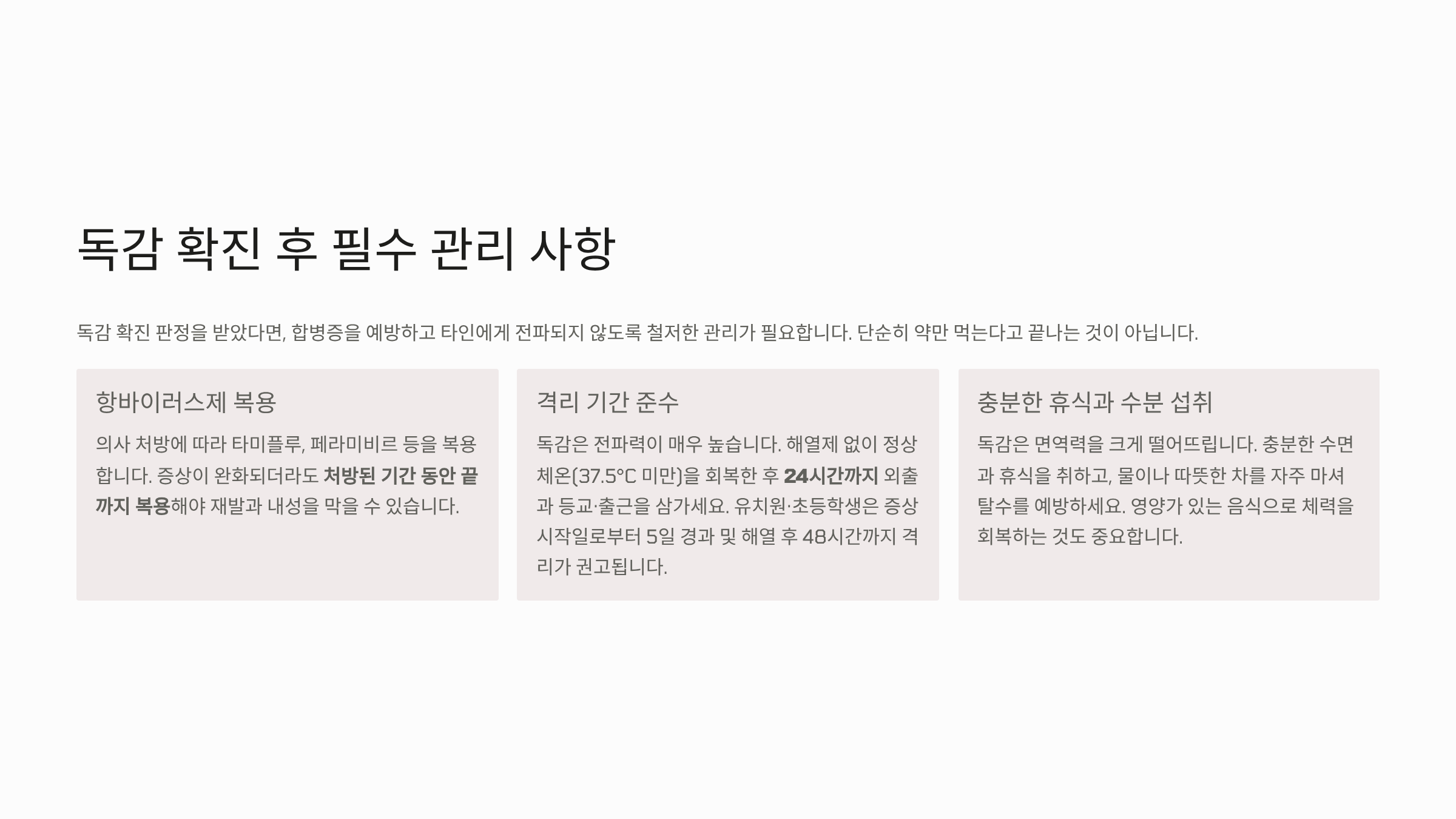 독감 확진 판정을 받은 후에는 합병증을 막고 타인에게 전파되는 것을 막기 위한 철저한 관리가 필수입니다.
